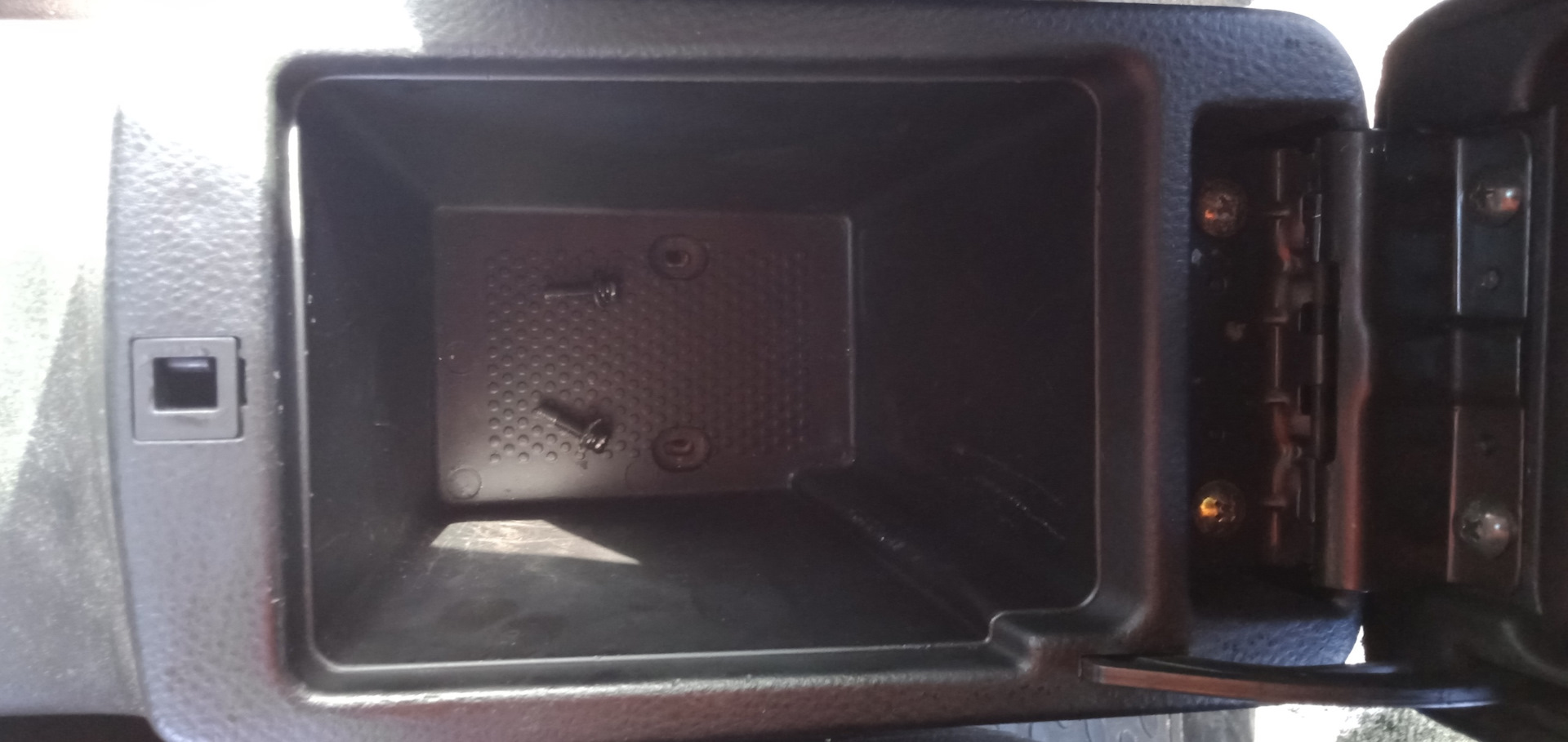 Отвёрткой выкрутил два винтика в "бардачке" подлокотника, чтобы освободить кожух центрального тоннеля.