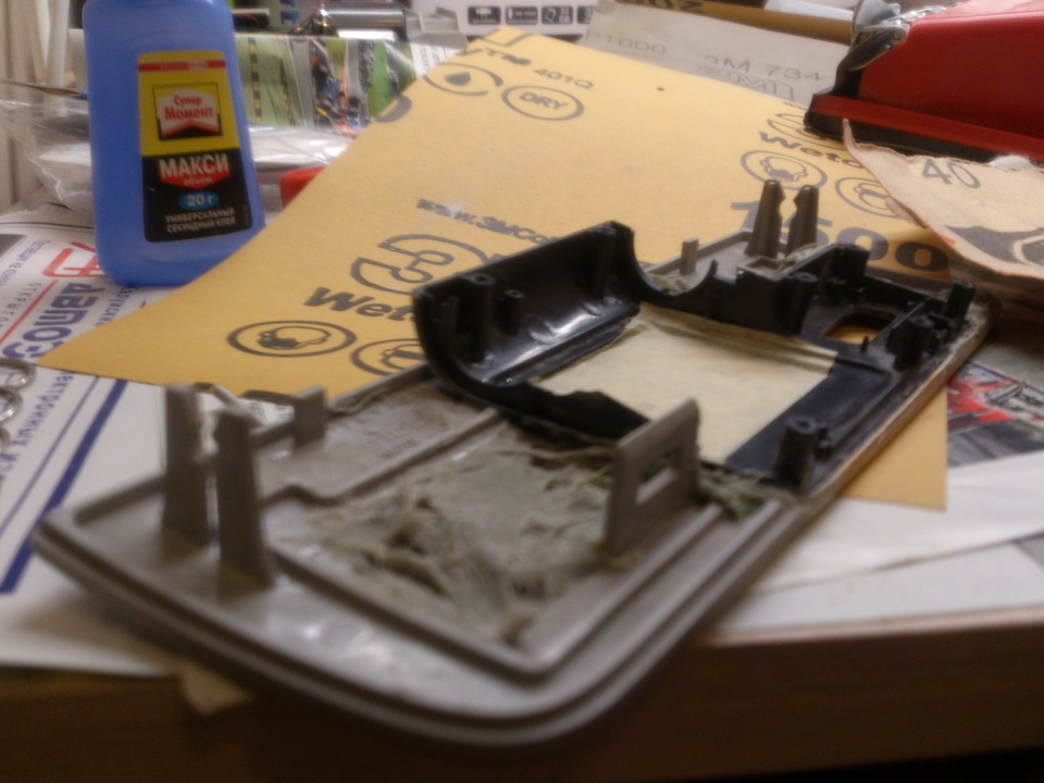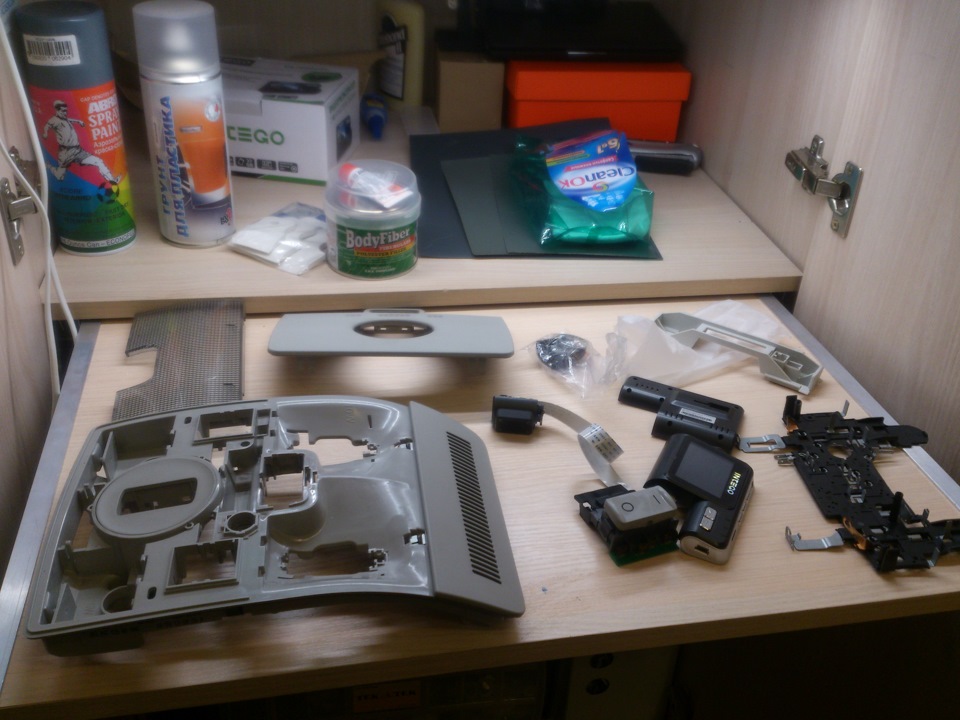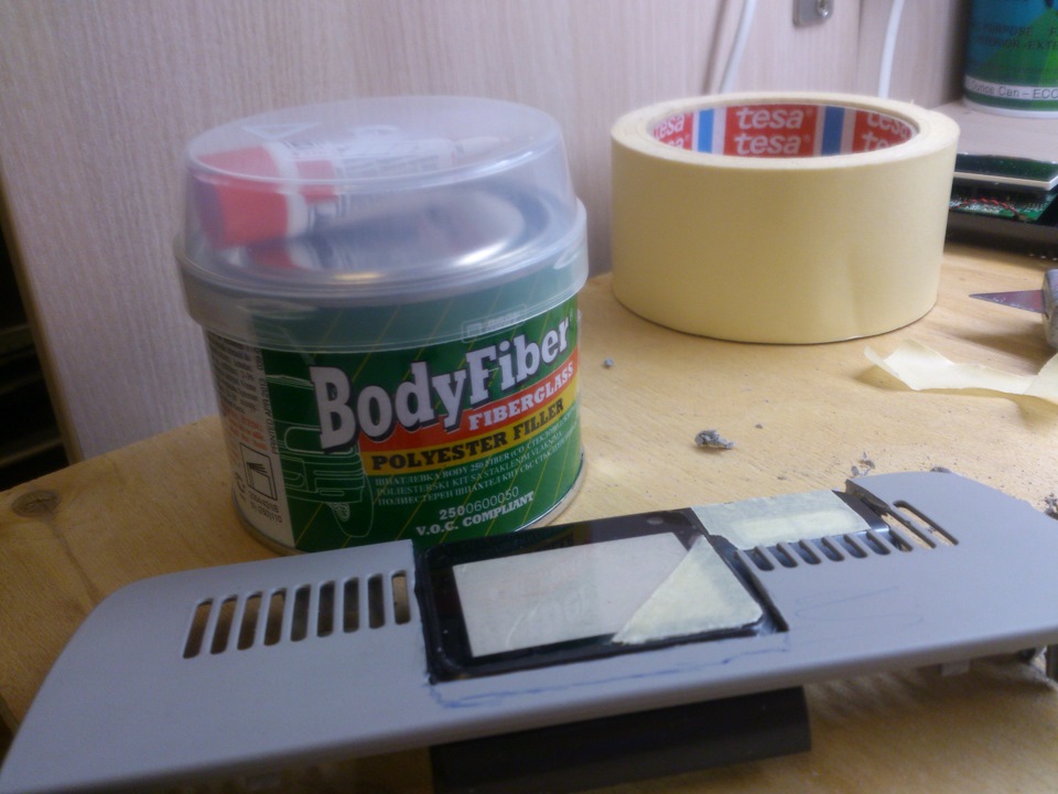 Далее была недельная эпопея с покраской. То цвет мне не нравился, то глянцевость, то фактура… В общем, забил уже весь шкаф всякими баллонами — уже жена ругается:) В итоге плюнул и купил плёнку виниловую с текстурой шлифованного алюминия и наклеил с феном на деталь. Получилось вроде ничего, но ниша с кнопками и лампочками после кучи перекрасов и перешкуриваний получилось неровной. Решил пока притормозить и оставить так, чтобы хотя бы заработало.