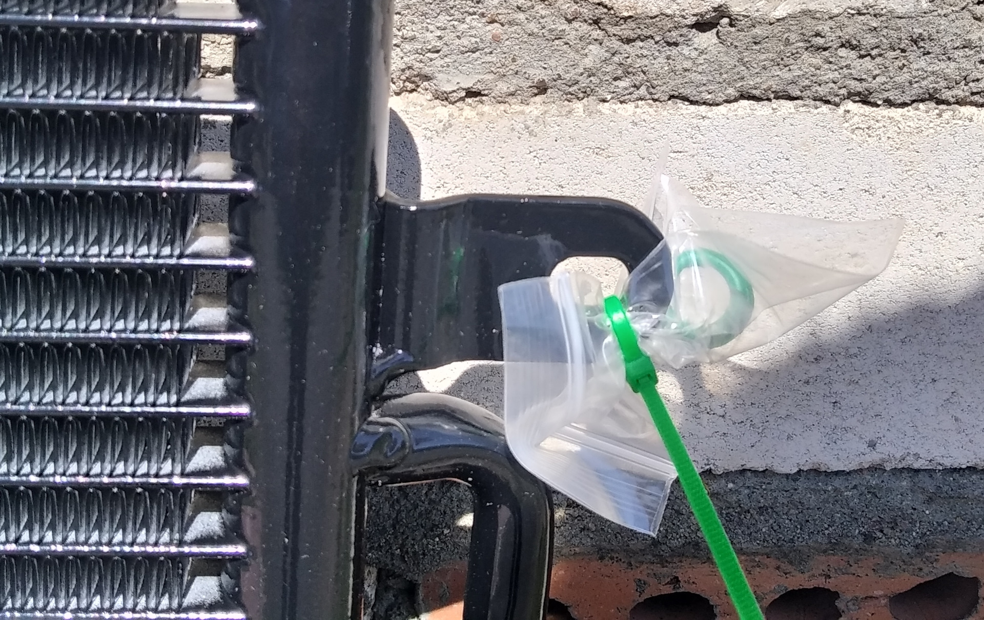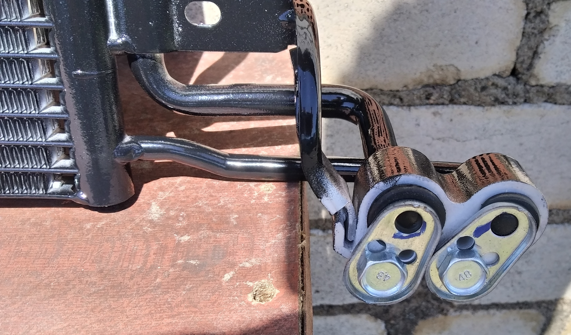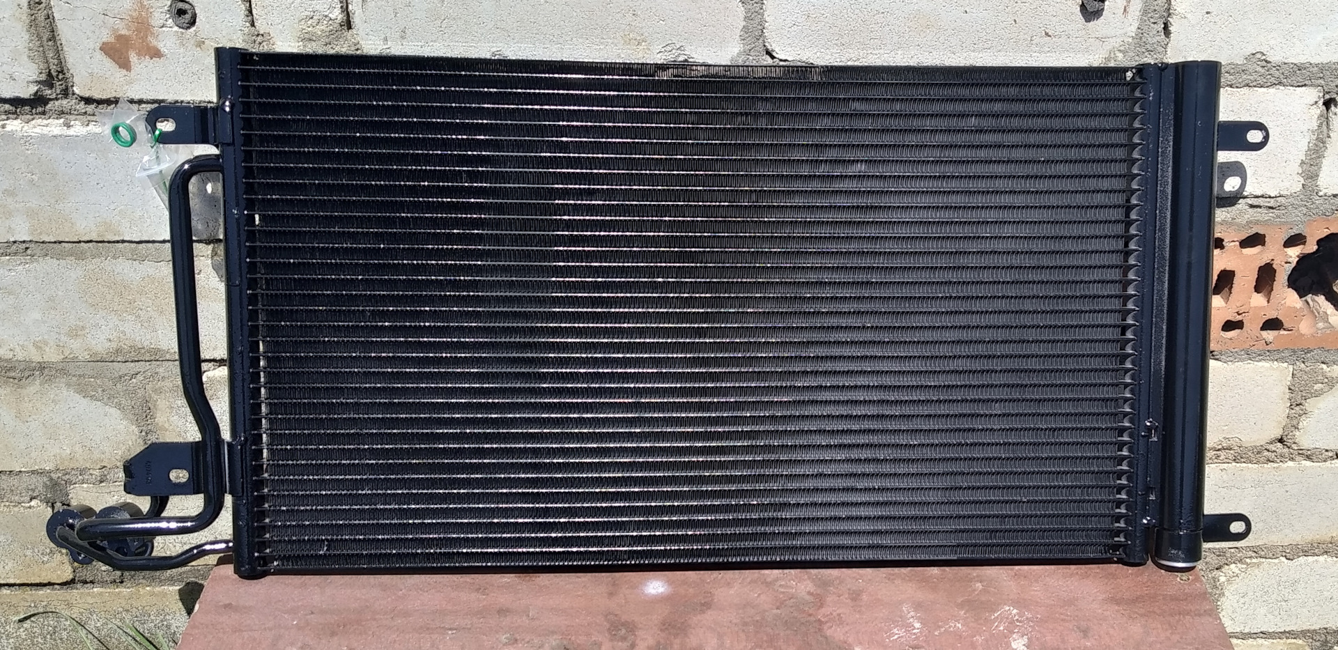 Также приобрел радиатор кондиционера. Причина покупки — фреон выходит за 3-4 дня. Почему сразу замена радиатора? Это самое слабое звено в системе. Поиск утечек ни к чему не привёл, светящихся пятен контраста нигде невидно, а вот радиатор внешне потрепан знатно, принял решение — менять.