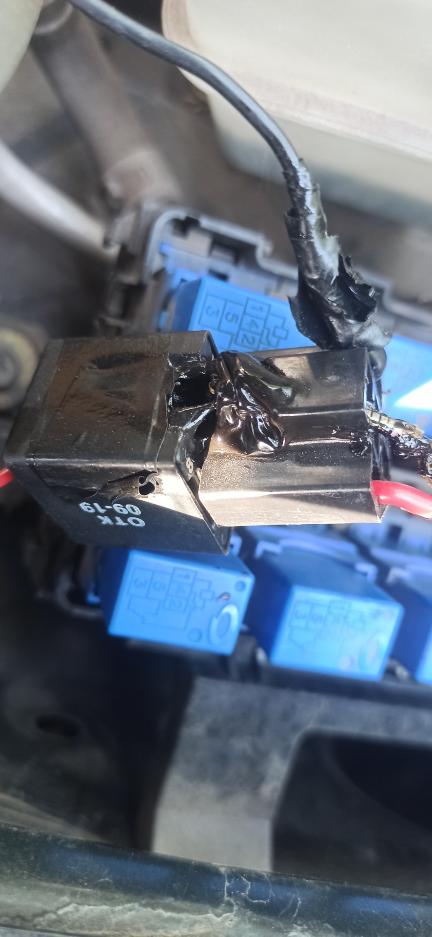 На улице жара +35. Решил съездить ополоснуть машину. По дороге домой почуял странный запах в салоне. Сначало подумал на кондиционер. Выключил его. Запах не пропал.ну ладно подъехал к дому, глушу машину, поскольку у меня стоит реле дхо, дальний горит до тех пор пока не упадет напряжение в борт сети до определенного значения. Но я этого не когда не жду, и выключаю их принудительно коротким включением ближнего. Но тут ситуация, дхо не выключаются. Тут я немного подумав понимаю что пахнет паленой электрикой, кто хоть немного знаком с радиотехникой знает как пахнут паленые транзисторы. Ну и поскольку дхо не гаснут полез сразу в монтажный блок под капотом. Отрываю капот а из блока реле просачивается дымок. Я немного офигел.