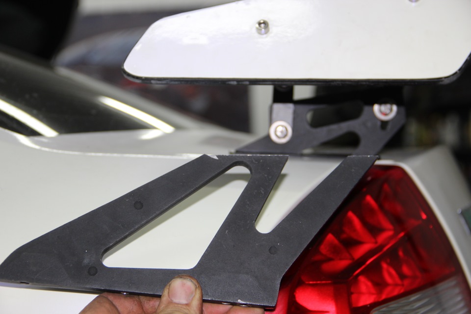 Стойки на котором крепился спойлер оказались слишком высокие и было принято решение их укоротить а закладные для креплений были поросуноты через небольшие отверстия на торцах спойлера. После установки покатался день но вид крыльев на торцах спойлера мне не пнровился, да и выпирали они слишком на мой взгляд.Очень помогли ножовка по металлу и шлифмашинка!