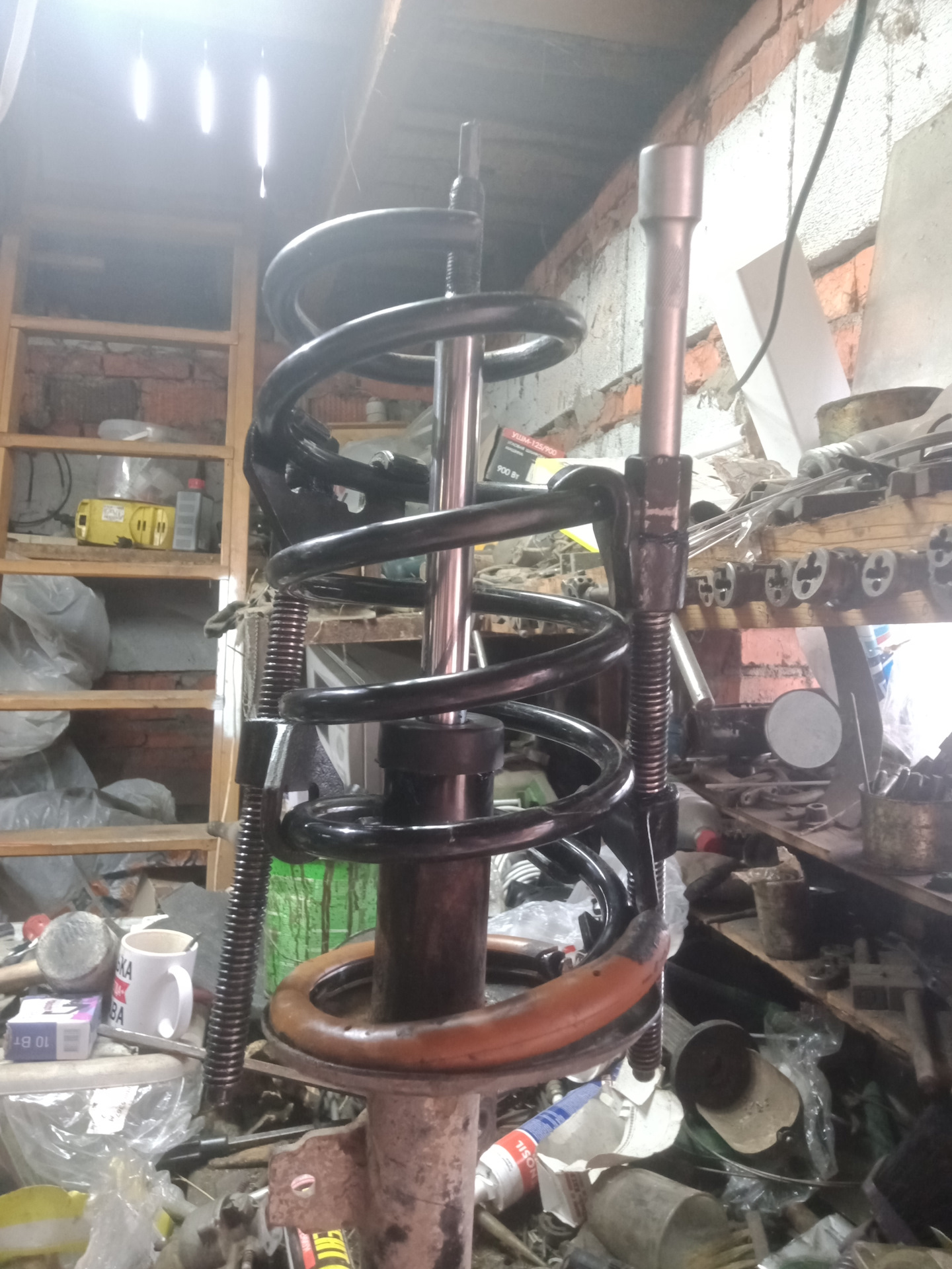 По снятию стоек ничего нового — сверху откручиваем стойку от кузова, снизу от кулака и стабилизатора. 4 гайки всего — ключи на 16, на 18 и на 21. И один болтик — ключ на 10 — кронштейн провода абс. Стойку тащим в гараж, закрепляем чтоб стояла, стяжками стягиваем пружины, и откручиваем верхнюю чашку и все с ней причитающееся. В общем все по инструкции.