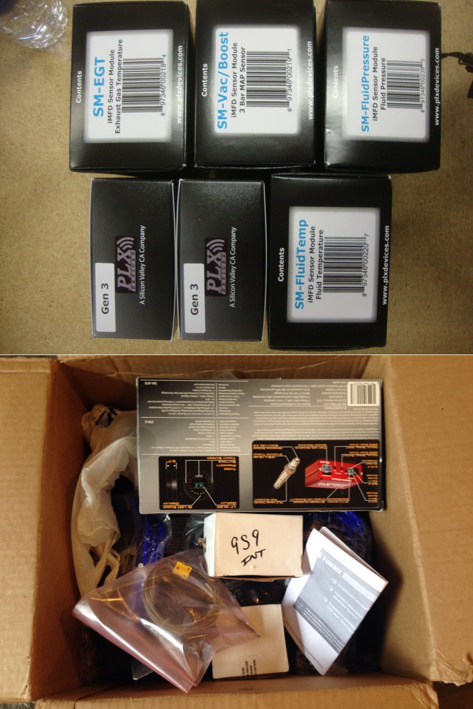 Самой последней приехала коробка с датчиками PLX. Данный производитель, позволяет устанавливать прямое подключение к плате K-Pro. С помощью которой собственно и производится настройка машины. Таким образом, в записываемых логах можно увидеть показания всех датчиков, что очень информативно.