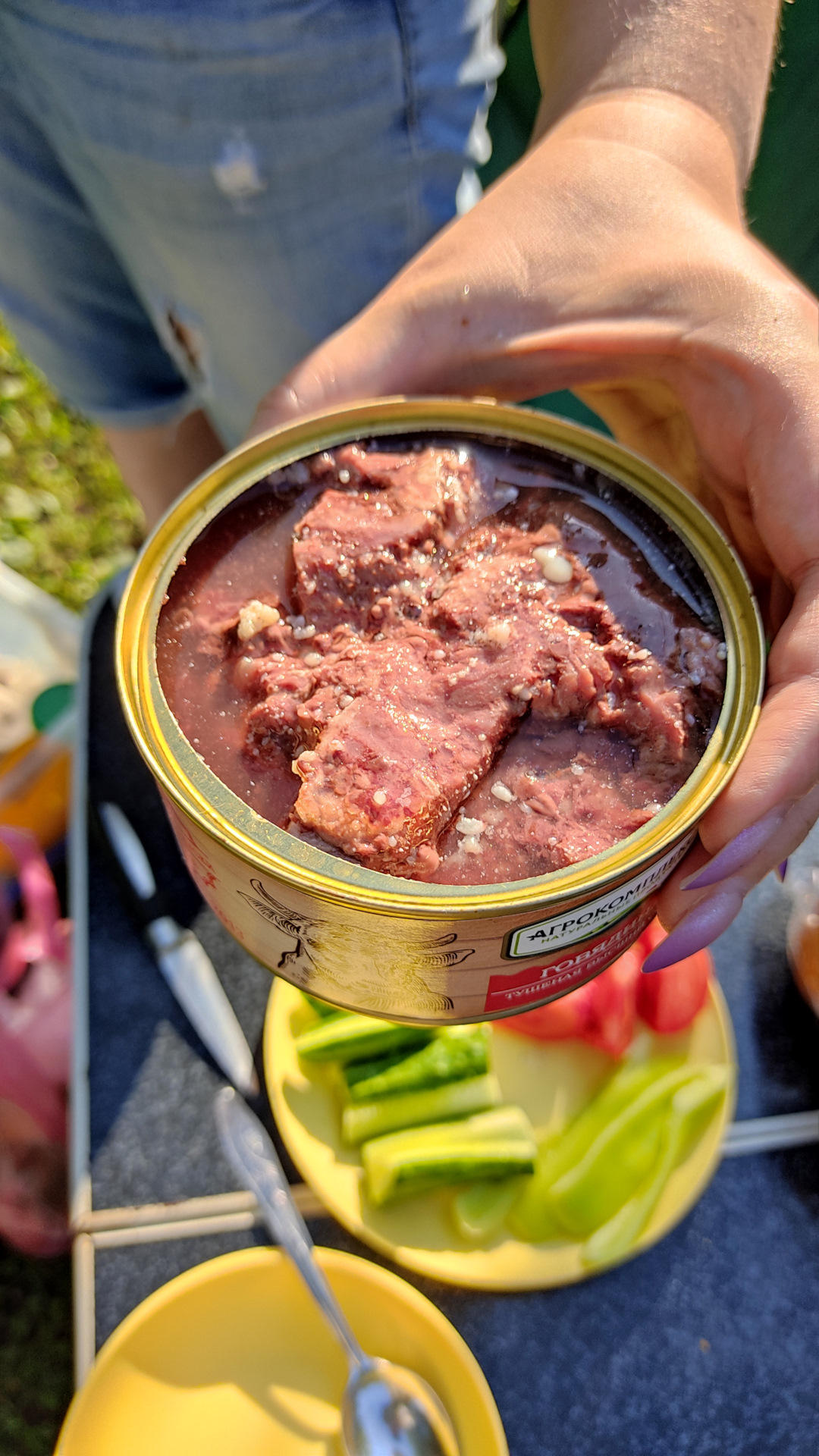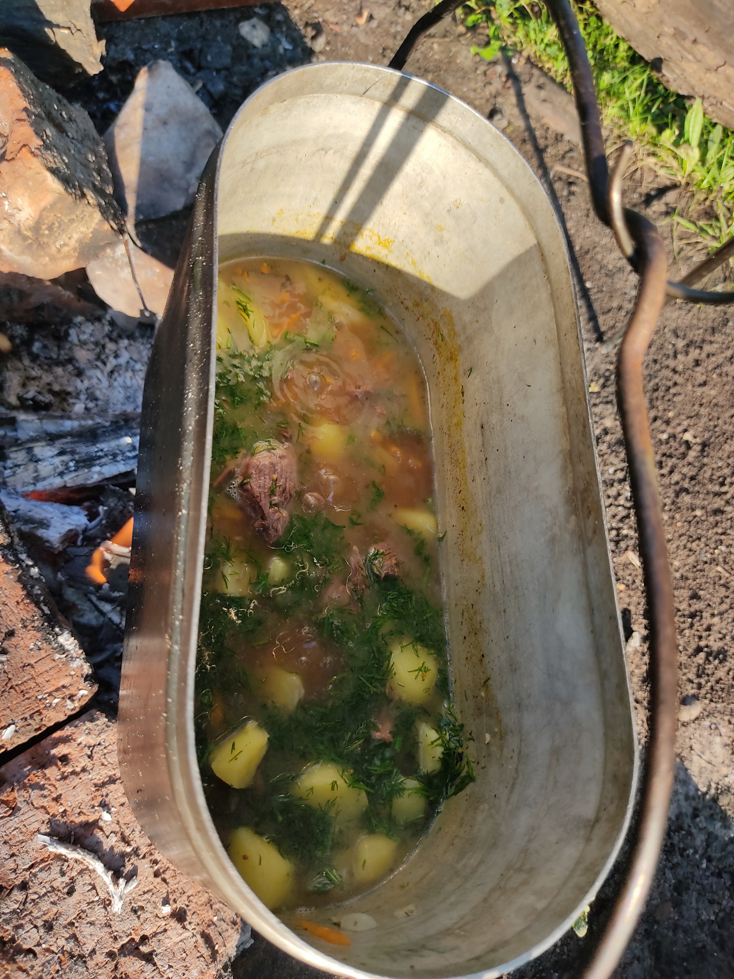 Проголодались. Уже традиционная картошечка с тушёночкой в котелке под дымок костра. Очень просто и очень вкусно.