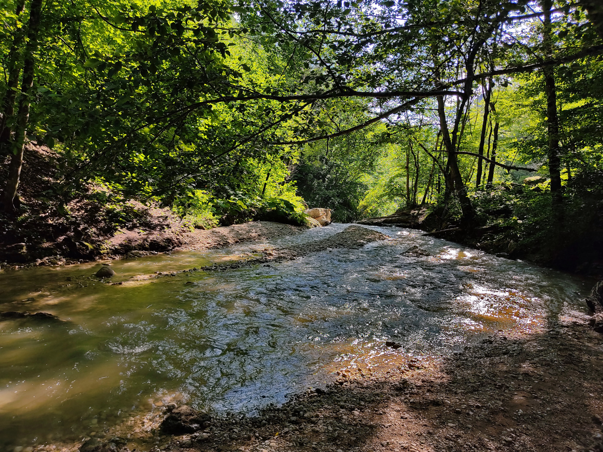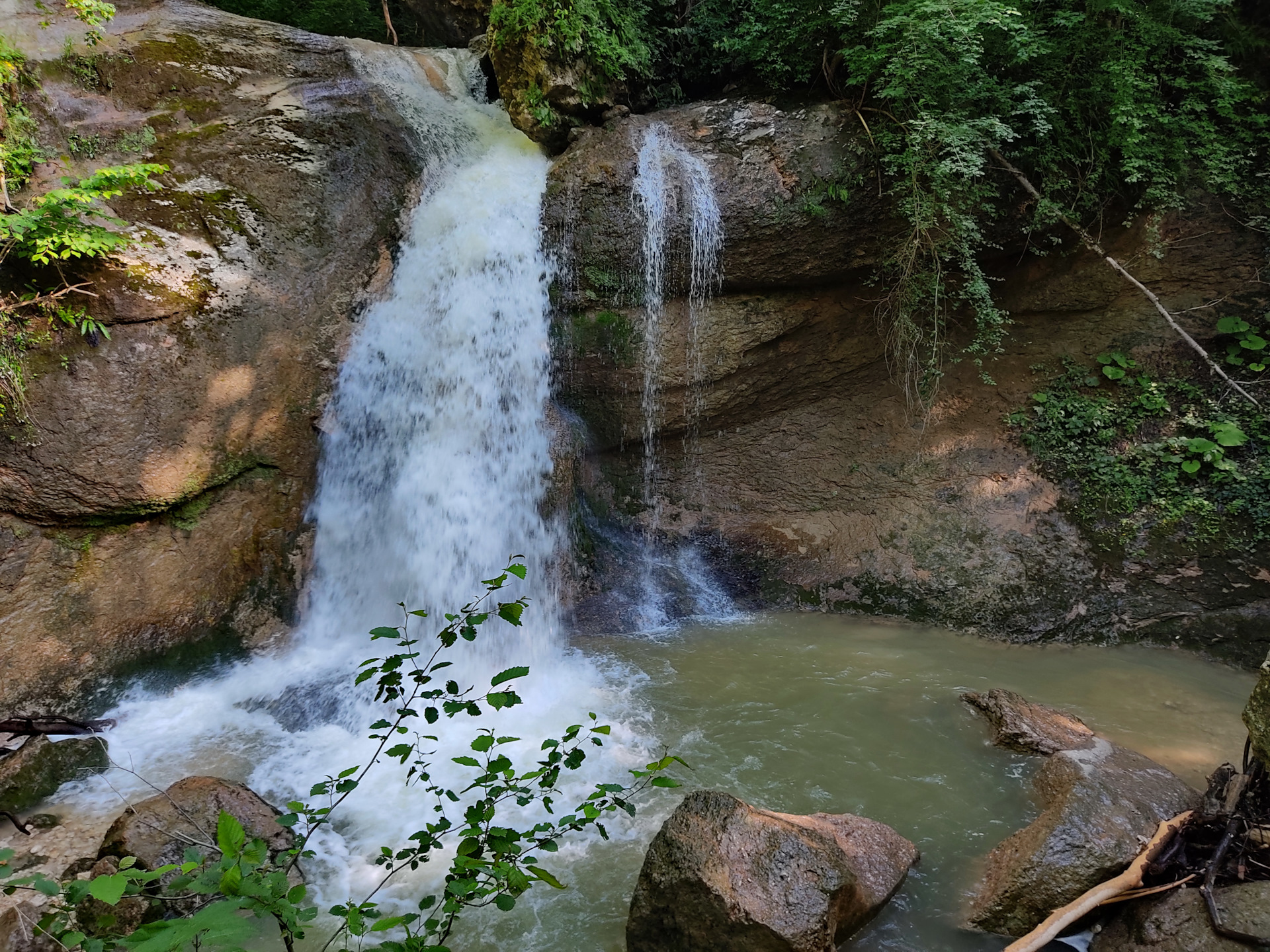 Спуск к водопаду в ущелье и при 100% здоровья вызывает сомнения, уклон в 50-60 градусов по сырому грунту метров 70 вниз (если прямо, а тропа виляет), это значит потом столько же вверх! Лифта нет… Дышим. Потеем, хлебаем воду, немножко материмся и… дышим…, глубоко и часто дышим!