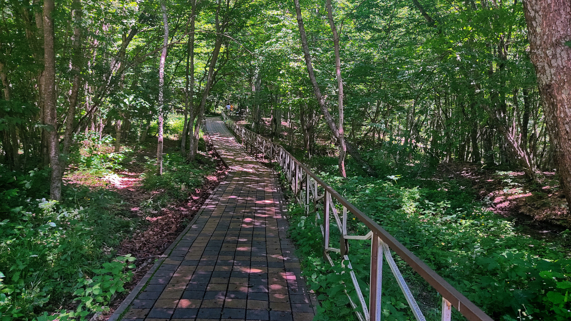 Здесь тихо! Плиткой выложенная дорожка с перилами, фонарями и лавочками, ухоженная и аккуратная, идет через лес на гору к Святому источнику. Уклон небольшой, идти 20 минут. Никто не бежит, не шумит, не суетится. Всё размеренно и умиротворенно.