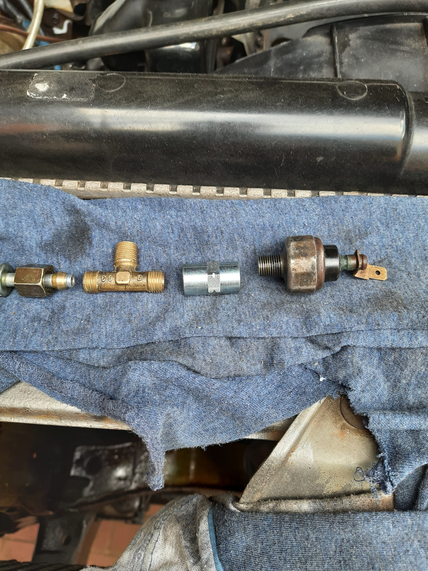Местом "встречи" датчика и двух магистралей (от указателя КАМАЗ и кронштейна фильтра масла) стали тройник от пневмосистемы КАМАЗ. Датчик подключен через прямой переходной штуцер М10х1/М10х1