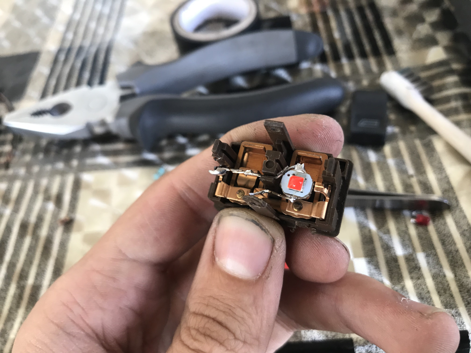 Теперь берём светодиод, снимаем его с патрона, и благополучно внедряем в клавишу.