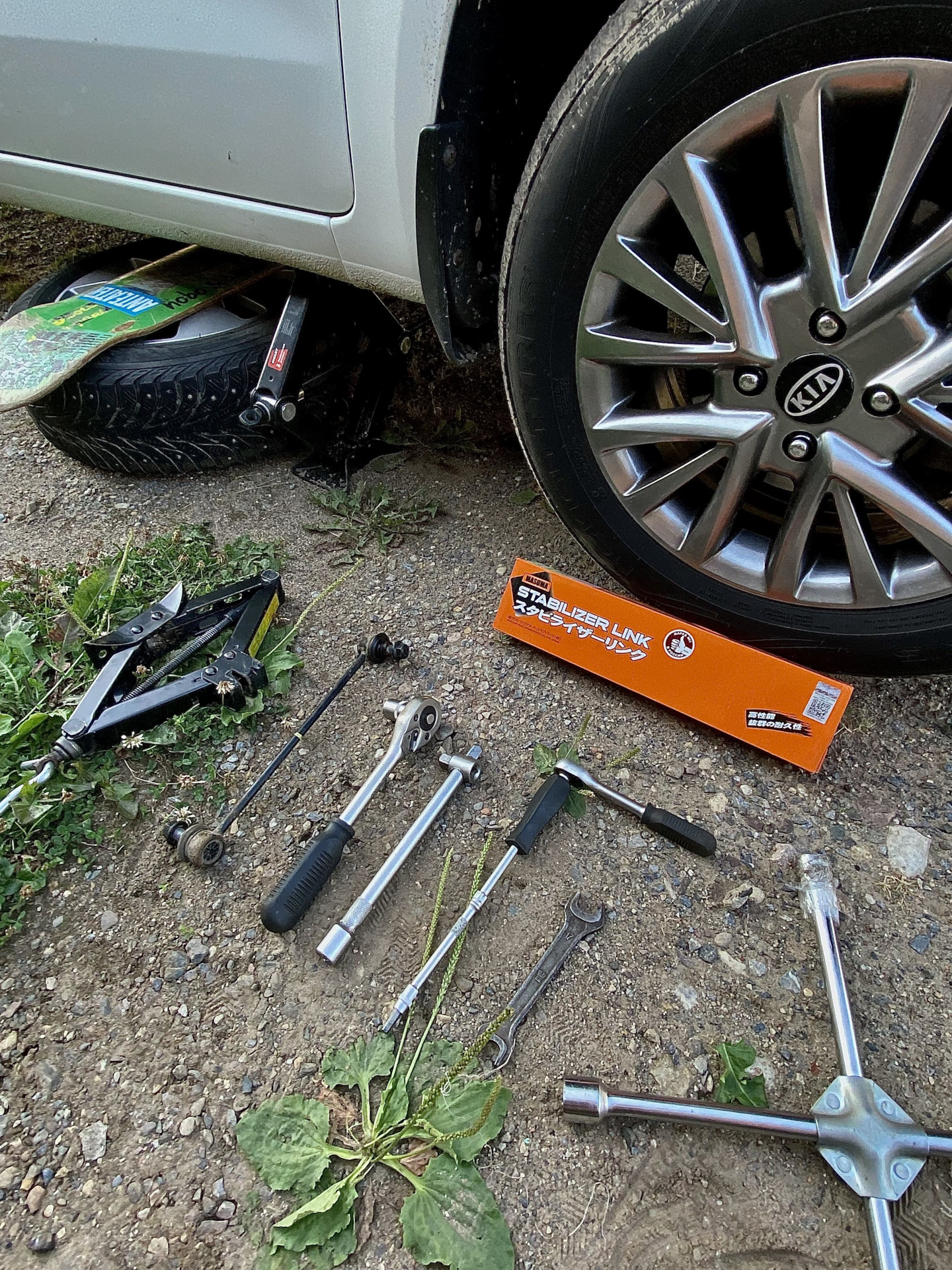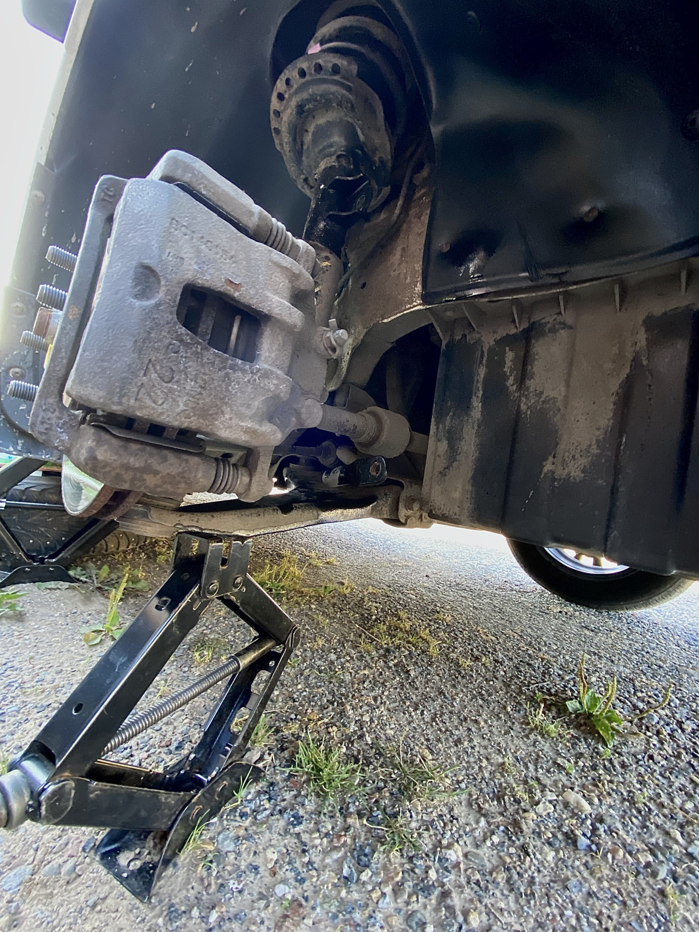 Ослабляю гайки на колесах, далее домкратим, подкладываем что-то для страховки (в моем случае это очень актуально, т.к. не самый лучший домкрат, в дальнейшем хочу приобрести подкатной)