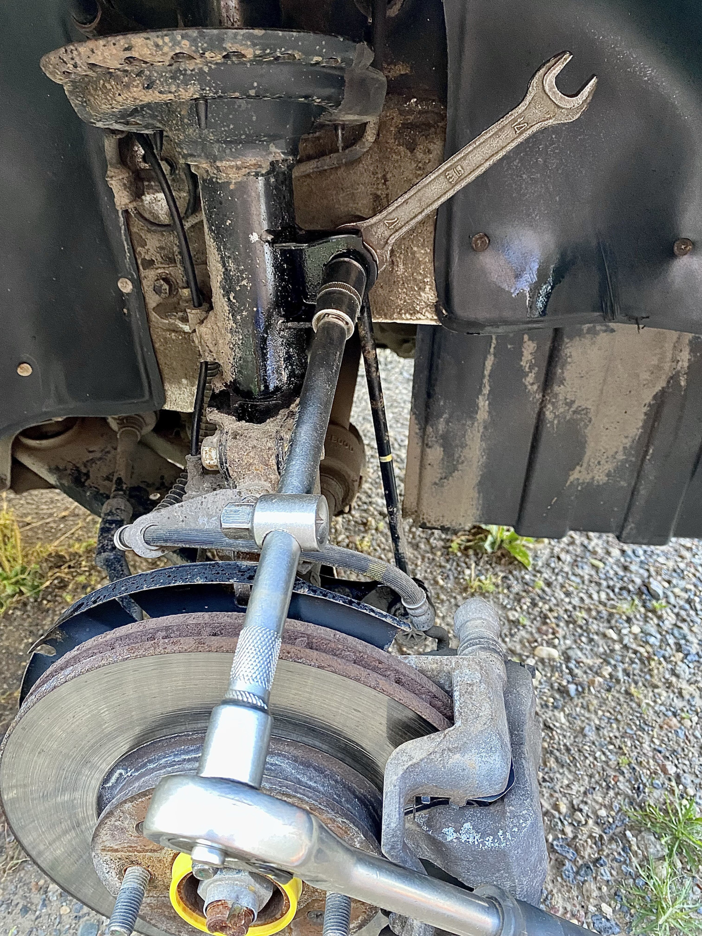 Воротком начинаем раскручивать. Когда гайка начнёт проворачиваться, контролируем ее рожковым ключом на 17, с нижней этого не потребовалось