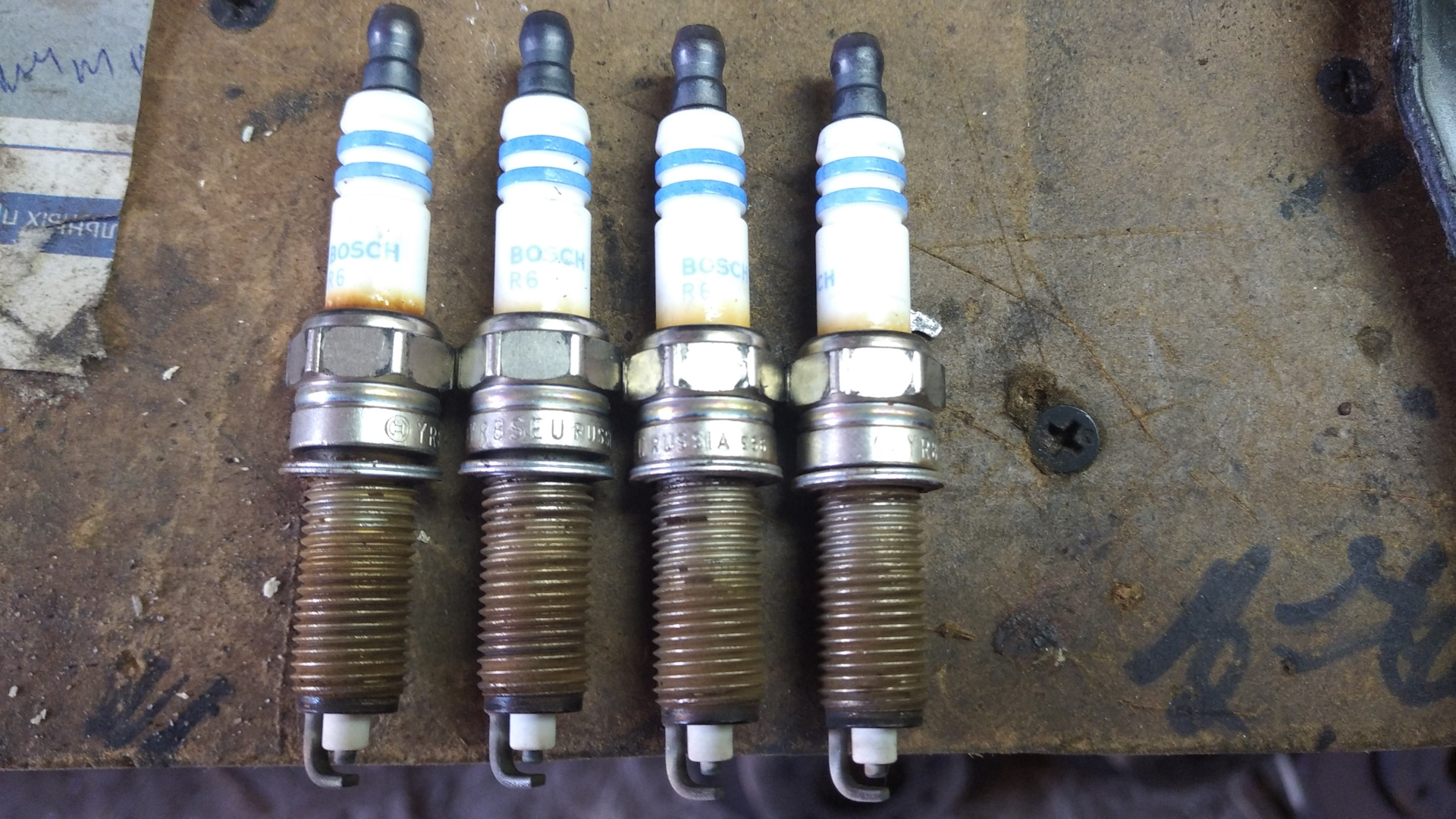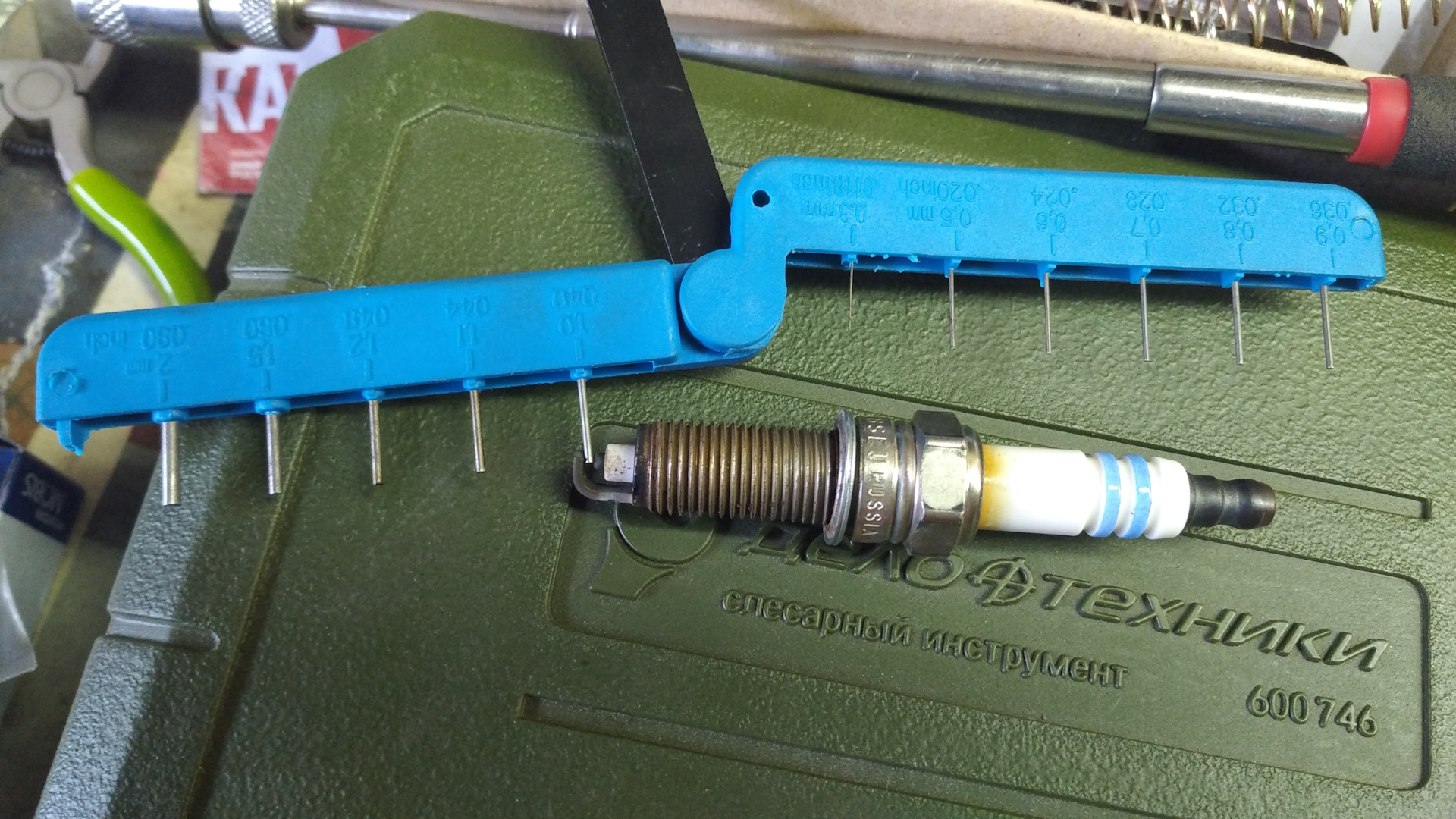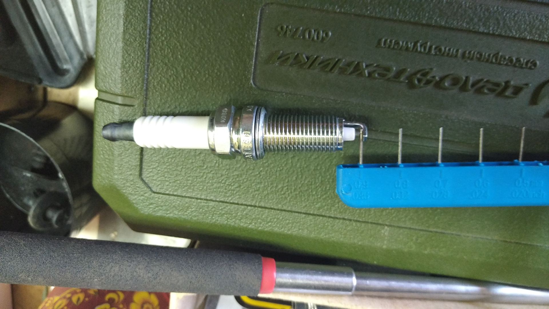 Выкрутил старые свечи из головки блока и приступил к осмотру их. Заменил щупом зазор между электродом 1.0 мм ровно на всех 4 свечах как и было. А вот на всех новых свечах зазор 0.9 мм зазор между электродом.