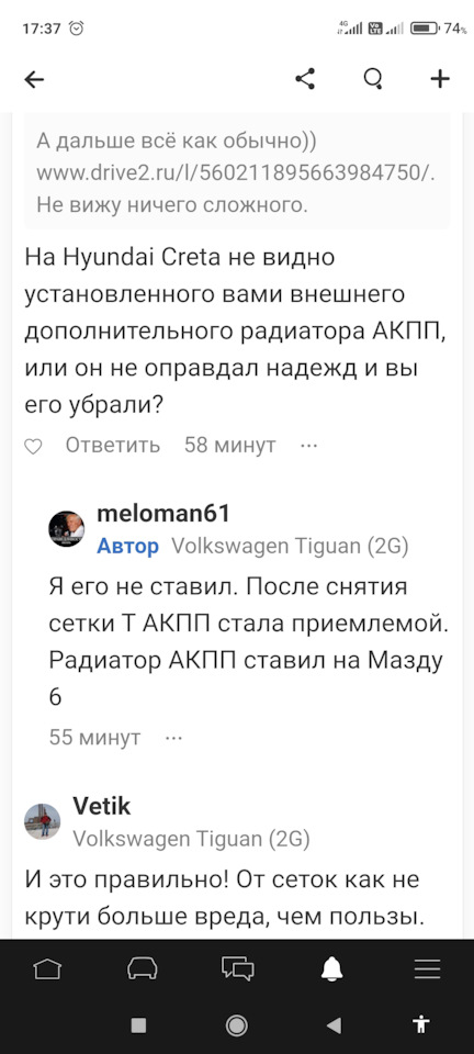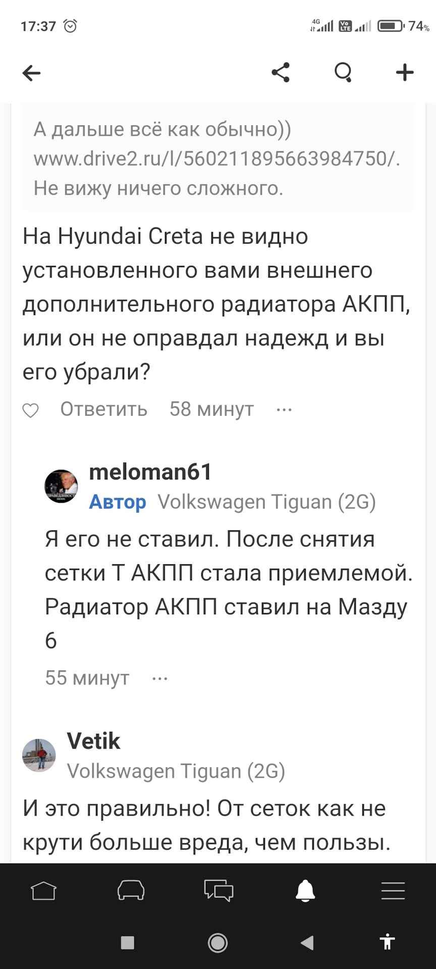 Приемлемой, это меньше 100 градусов? Мониторил программой Car Skanner, за час езды по трассе при +20 при скорости 120 км/ч температура АКПП ДОШЛА ДО 99 градусов А что было при + 30 при полной загрузке, 10 ЧАСОВ — УЖАС ( но я этого не знал). Меньше знаешь — лучше спишь:) . У меня тоже стоит сетка, буду убирать. А хотел поставить дополнительный радиатор на АКПП. Читал ваши посты на club-creta.ru/forums/topi…dvs-dopolnitelnye/?page=7 "Радиаторы охлаждения масла АКПП и ДВС (дополнительные)"