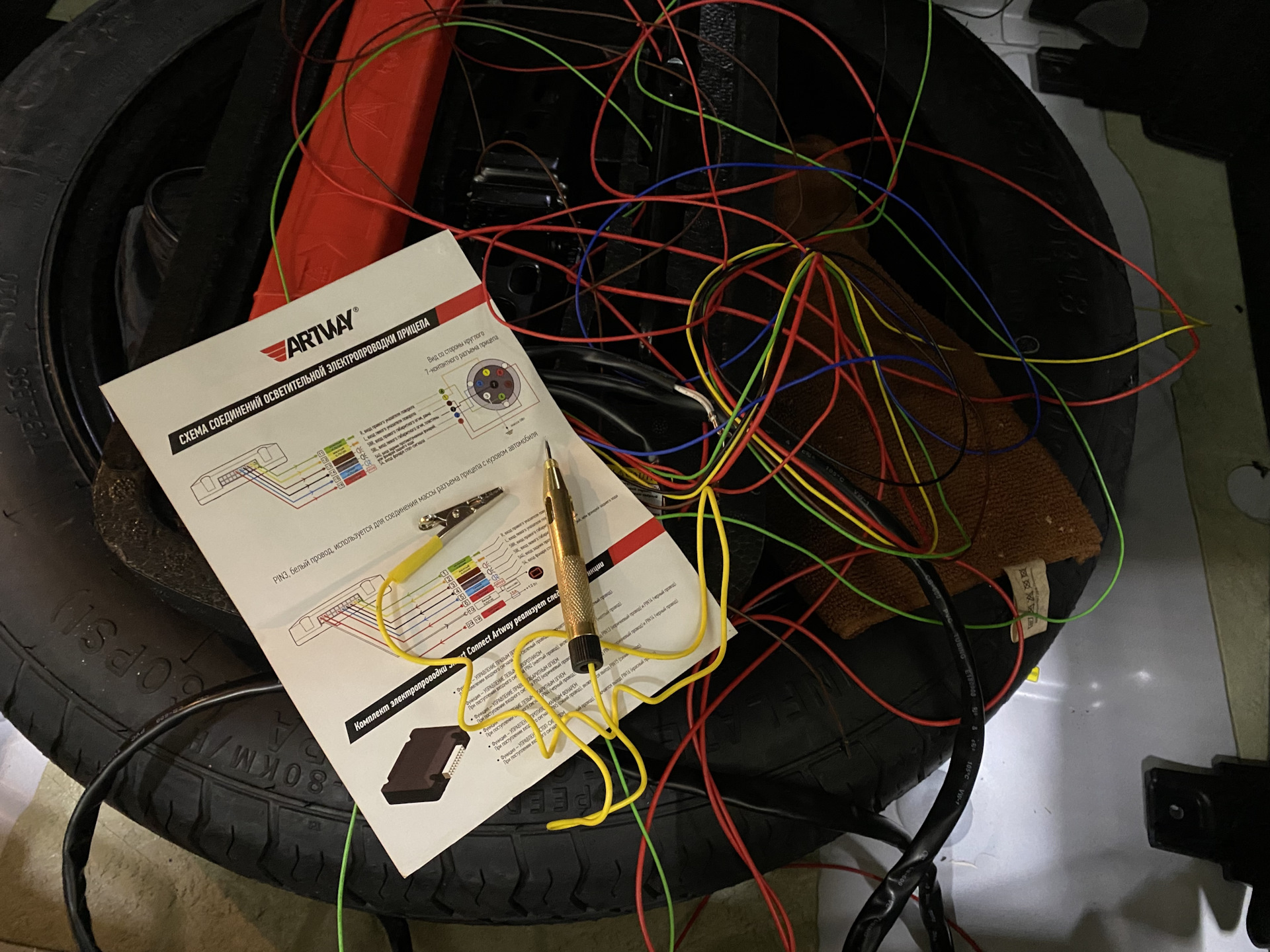 Решил себе установить фаркоп. Выбирал между обычным и «американским» быстро съемным. Больше понравился обычный + он ещё и дешевле. Заказал у Александра с Джили клуба (geely-club.by/viewtopic.php?f=149&t=149). Фаркоп с проводкой обошёлся в 410 рублей. Установка простая, но нужно сверлить дырки в лонжеронах. Самый геморрой это правый лонжерон, внутри идёт крепление для буксировочного крюка и сверлится он категорически не хотел))) В итоге, потратив несколько часов и 4 сверла, отверстие было проделано. Все отверстия обильно промолвили. Сама установка в уже готовые отверстия заняла около 15 минут. Далее проводка. Купил себе копеечный тестер и проверил провода в месте разъёмов и выходящие из общей проводки под задние фары (у меня цвет проводов в фишке фар отличаются по цвету от выходящих из общей проводки). Получилось следующее, может кому пригодится.
