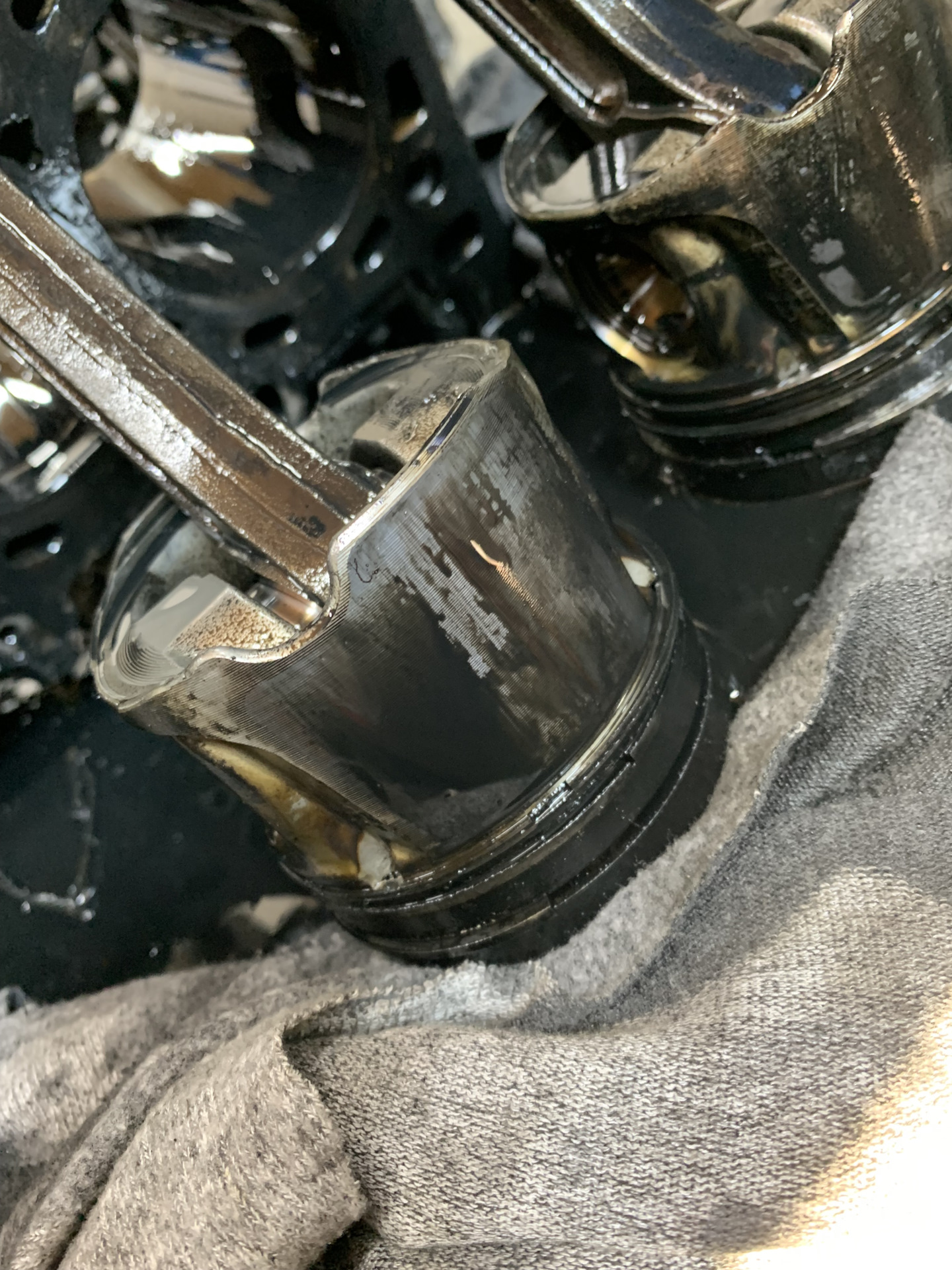 Причины их появления на этом этапе не понятны, надо разбирать блок. Но по результатам измерения цилиндра понятно, что надо растачивать на 2 ремонтных размера. И собирать на новых ремонтных поршнях. Посмотрел стоимость ремонтных поршней и сроки поставки — только оригинал, под заказ от 15000 руб/шт и 15-20 дней. Однако… И есть одно НО (со слов моториста) — проверить размеры цилиндра в конце, ближе к коленвалу, возможности нет, микрометр не достает. А это значит, что если там выработка больше 2-го размера, то расточка не поможет. Кстати, хон в цилиндрах сохранился.