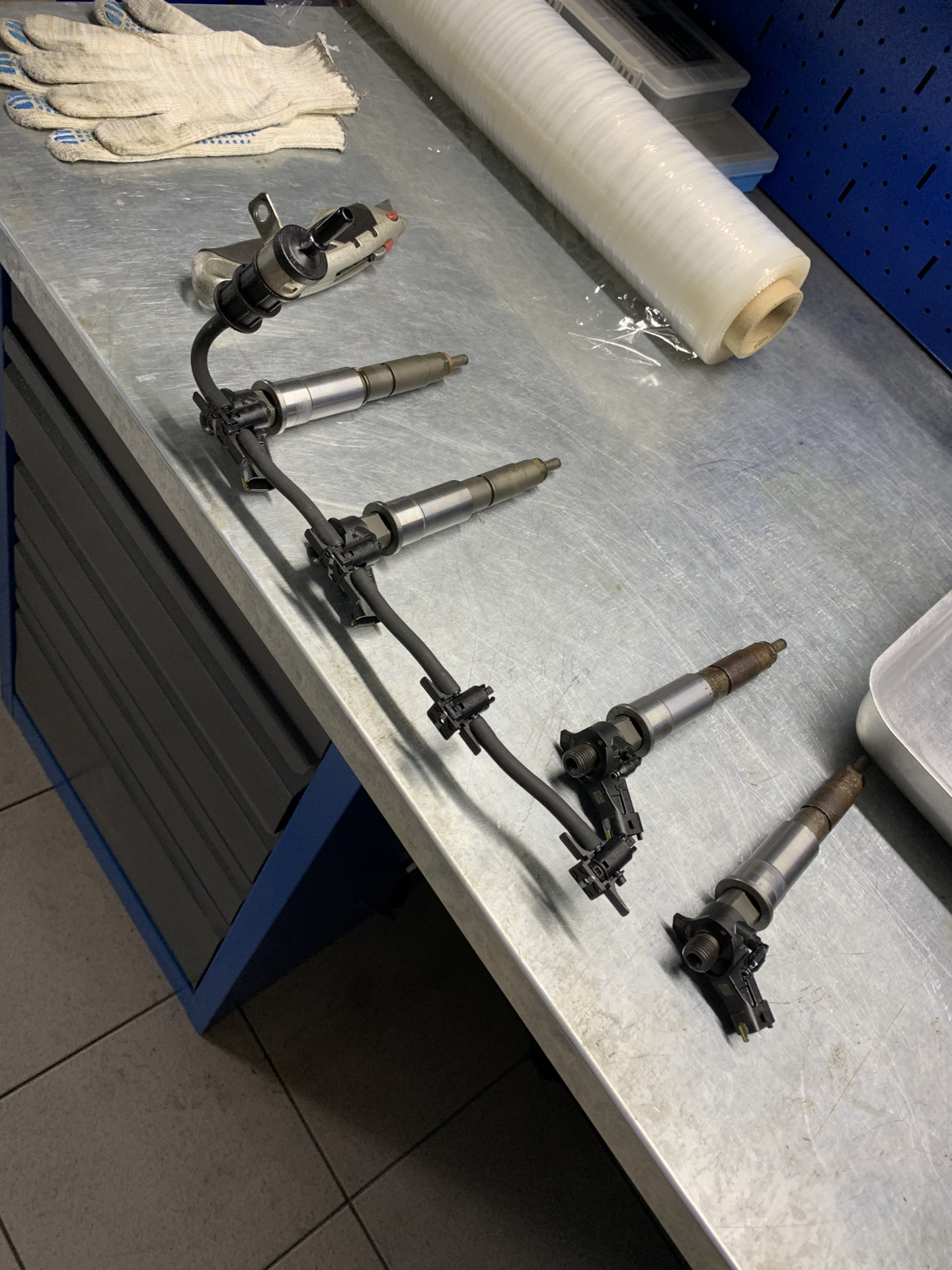 Ладно, отвёз. Снова диагностика, и вердикт — одна форсунка (со второго цилиндра) под замену — неисправен пьезопакет. Предложили обменять на восстановленную за 9000 руб. Остальные три — разбирать, чистить-промывать, собирать, калибровать-настраивать, будут работать дальше. По 5000 руб за штуку. Итого на форсунки 24 000 руб.