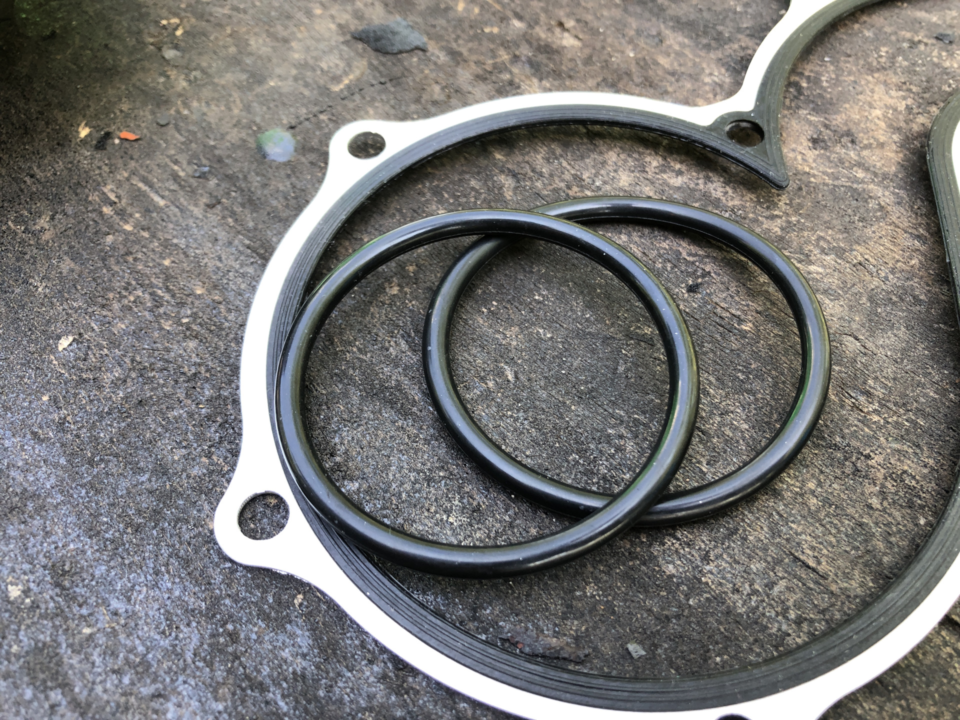Одно резиновое колечко устанавливается непосредственно между блоком двигателя и кронштейном помпы, другое — на пластиковый патрубок, где термостат.