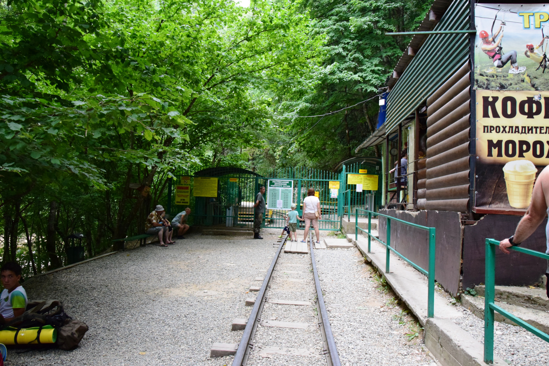 Привет, по рельсам везут 3 км, потом конечная остановка, там кафе есть, дальше пешком