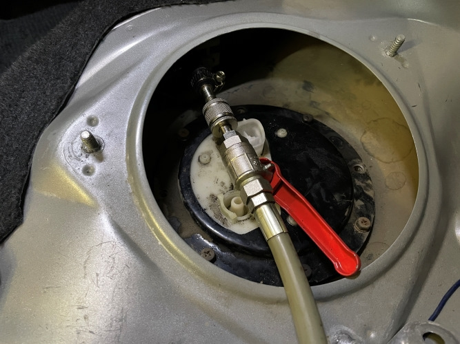 Следующий на подозрении был бензонасос. Начал с проверки давления топлива в системе. Так как подключиться к рампе очень не удобно на моей инсталляции мотора — он расположен близко к моторному щиту, я решил подключиться от сторонней емкости вовсе исключив из системы бензонасос.