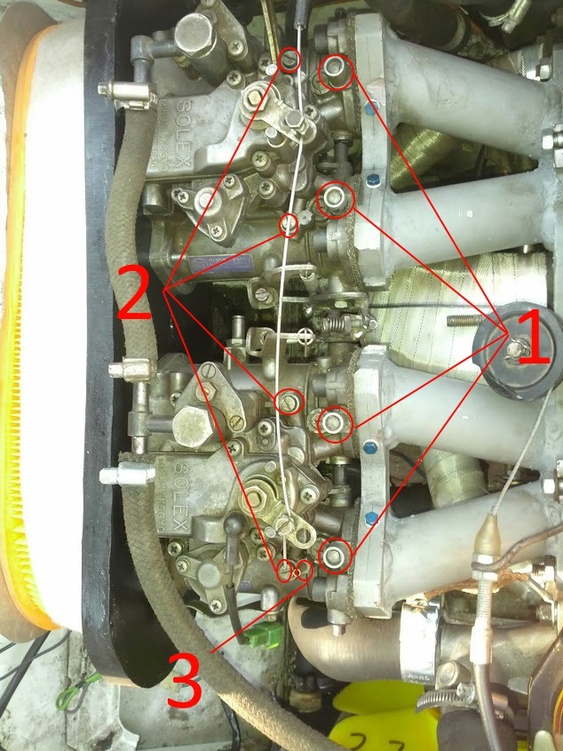 1 —жиклёры Ускорительного Насоса2 — винт качества ХХ3 — вакуум на трамблер4 — общий винт скорости ХХ5 — винт синхронизации карбюраторов