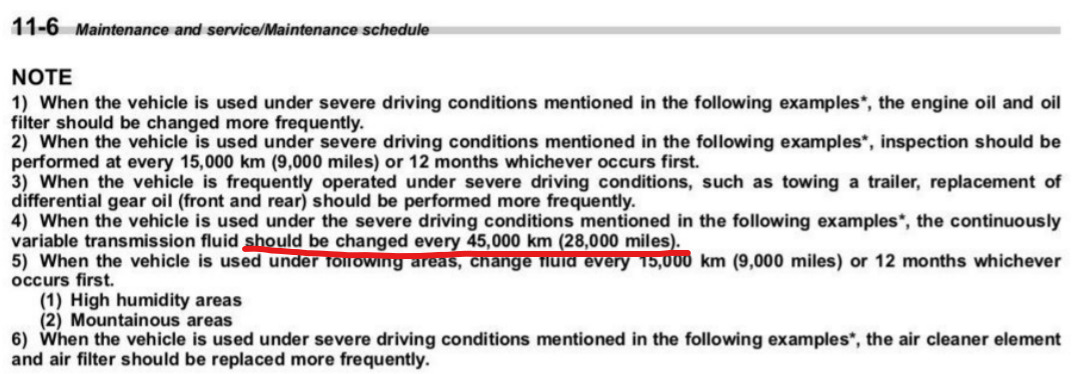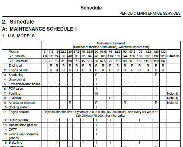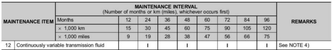 Идем в раздел "Maintenance Schedule I" и что мы видим? Видим мы строчку "CVTF", где указано проводить "I" (Inspection) каждые 48 тыс.км (или 30 тыс.миль), и так вплоть до пробега 220 тыс.км. "Ну вот! Мы же говорили!" скажут те, кто и говорил про "нечего ее трогать"! И будут правы)