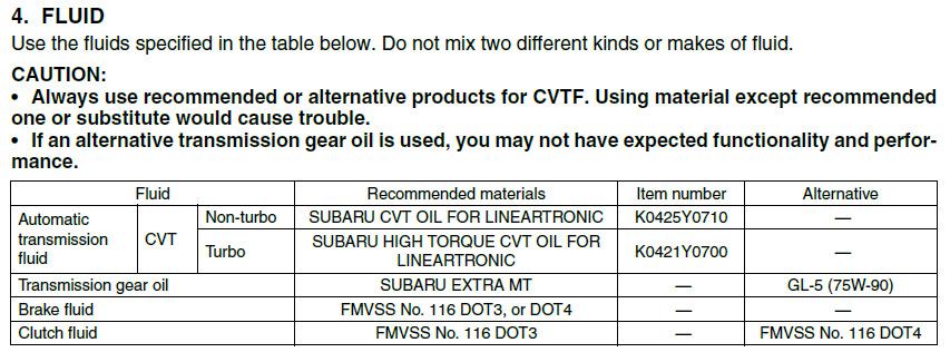 Кстати — именно эта страничка из мануала на форя — беда многих сервисов, которые "на опыте" честно льют "красную" жижу K0421Y0700 "в турбо субару", и в леворга тоже. Если пробег на жидкости приличный, понять, какого она была "изначального" цвета не всегда возможно — у меня, например, она была коричнево-желтая. А потом после такого "компота" владелец мучается: вариатор начинает "пинаться", буксовать и "дергаться". Будьте внимательны: на "турбо" леворгах в кузове VM4 — стоит TR580, в который жижу надо лить "зеленую" K0425Y0711!