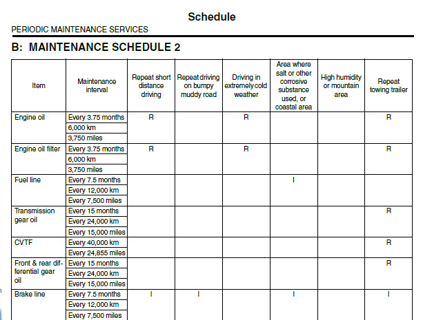 Но листаем ниже и видим еще одну табличку: "Maintenance Schedule II" про "сложные условия эксплуатации", строчка CVTF с периодом замены 40 тыс.км (25 тыс.миль), а в ней — колонка с "регулярным тяганием трейлера-прицепа" и буковкой "R" (Replace)! "Ага! Менять-то надо!" скажут те, кто "топил" за регулярную замену. И тоже будут правы))