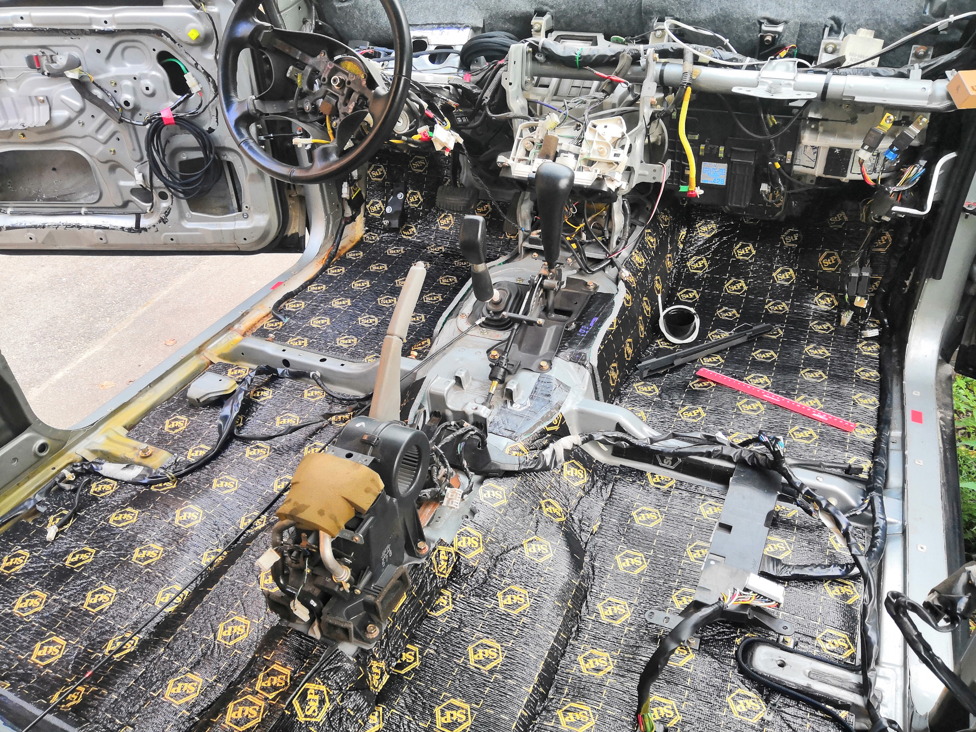 Всё таки не зря сделал гидроизоляцию пола. Изначально планировал кинуть поверх выкройки из туристического коврика, но повёлся на рекламу новомодных шумок с их клеевым инновационным клей-герметиком.