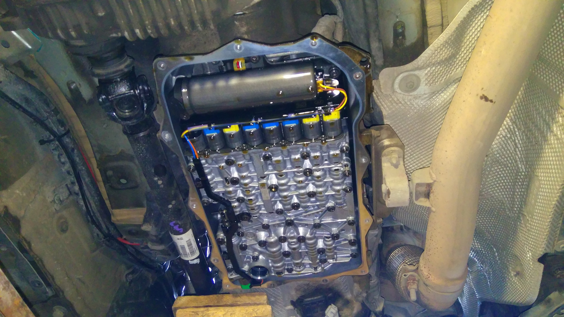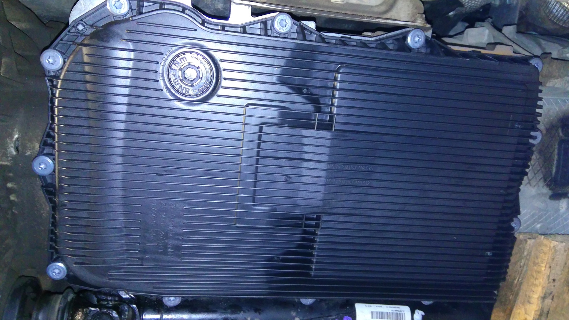 Переходим к АКПП, шестигранником на 10 откручиваем сливную пробку на поддоне (фильтре АКПП), сливаем масло и откручиваем поддон. Снятый поддон оказался 2017 г.в., а значит предыдущий хозяин не обманул что менял масло в АКПП. Далее устанавливаем новый фильтр АКПП с поддоном, болты затягиваем в соответствие со схемой и моментами затяжки, указанными в TIS. Далее через Rheingold производим коррекцию уровня масла. В АКПП заменилось 4 с небольшим литра. Сброс корректировок АКПП не производил, прежде чем закидать меня помидорами за это, прошу посмотреть видос канала Zf center на Ютюбе