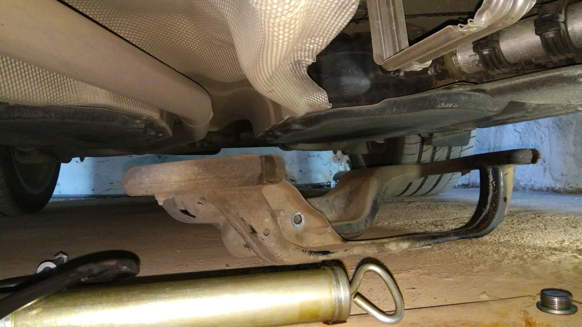 Раздаточная коробка ATC45L установленная на BMW Х6 F16, имеет только заливную пробку, также, как и на заднем редукторе, сливной пробки нет. Чтобы подобраться к заливной пробке и забегая в перед открутить все болты фильтра АКПП с поддоном нужно открутить подрамник, 4 болта крепления подрамника и 1 болт саленблока раздатки. Перед этим, АКПП в районе колокола ставим на подпорки что бы при снятии подрамника АКПП с раздаткой не упали вниз. Далее, уже знакомым шестигранником на 14, который приобретался для замены масла в редукторах, откручиваем заливную пробку на раздатке. По отработанной на заднем редукторе технологии, откачиваем шприцом масло из раздатки, у меня скачалось 500 мл, собственно столько же и залилось. Далее через Rheingold произвел сброс корректировок раздатки.