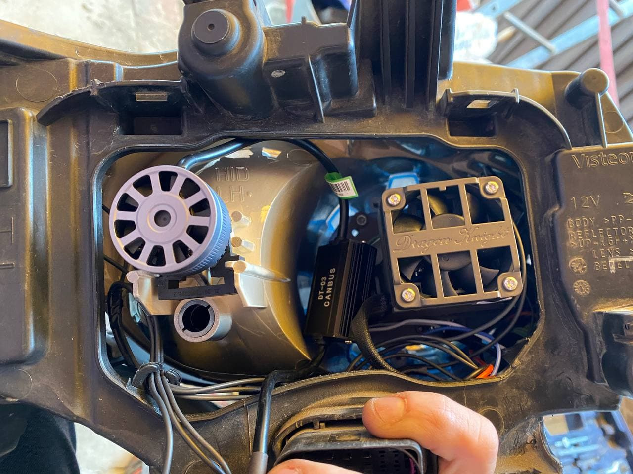 Да и в дальнейшем, проще заменить линзу целиком, чем сначала замерить блок розжига, который со временем все равно умрет, потом уставшие лампы, а потом все таки помутневшие линзы. Ну и из за того, что блок розжига убирается из фары, появляется немного места и я смог упихать в фару led лампу на дальний с кулером)