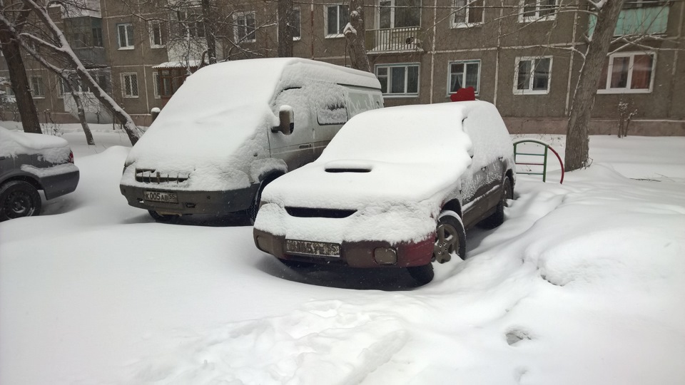 Вчера тиш да гладь, сегодня, бац и сугробы. Машина вчера была без снега вообще, а сегодня хороший слой снега. Кое-как дошел до машины, все буксуют. Романтика…
