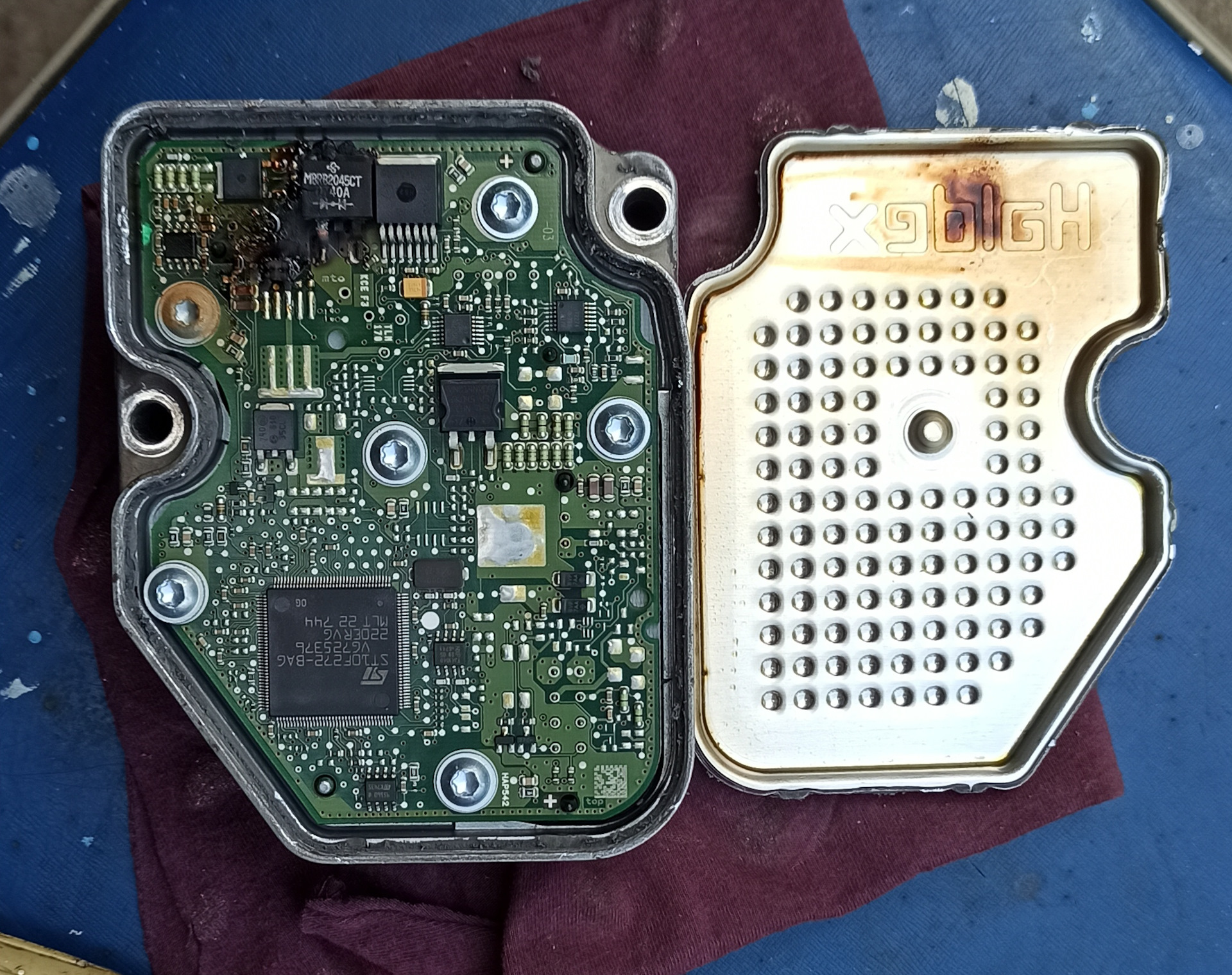 По итогу, после замены насоса, полный привод так и не заработал. При работающем двигателе я отчётливо слышал как работает сам насос муфты. Тут, при очередном обслуживании авто www.drive2.ru/l/596781102648017356/, решил я снять этот насос и подсоединить его напрямую к аккумулятору дабы проверить его визуально. Всё работает, крутит в нужном направлении. Ну, думаю, не в насосе дело… Снимаю бок DEM. Благо не сложно и быстро. Старый насос, а он сгорел, жутко вонял гарью! Нюхаю снятый блок — воняет! Ёлы — палы, вскрываю его и мои опасения подтвердились! Сразу скажу, если брать блок б/у, то брать нужно именно от такого же автомобиля (год и модельный ряд должны совпадать) и с такой же датой выпуска самого блока. Очень сложно, как оказалось, найти именно такой блок.