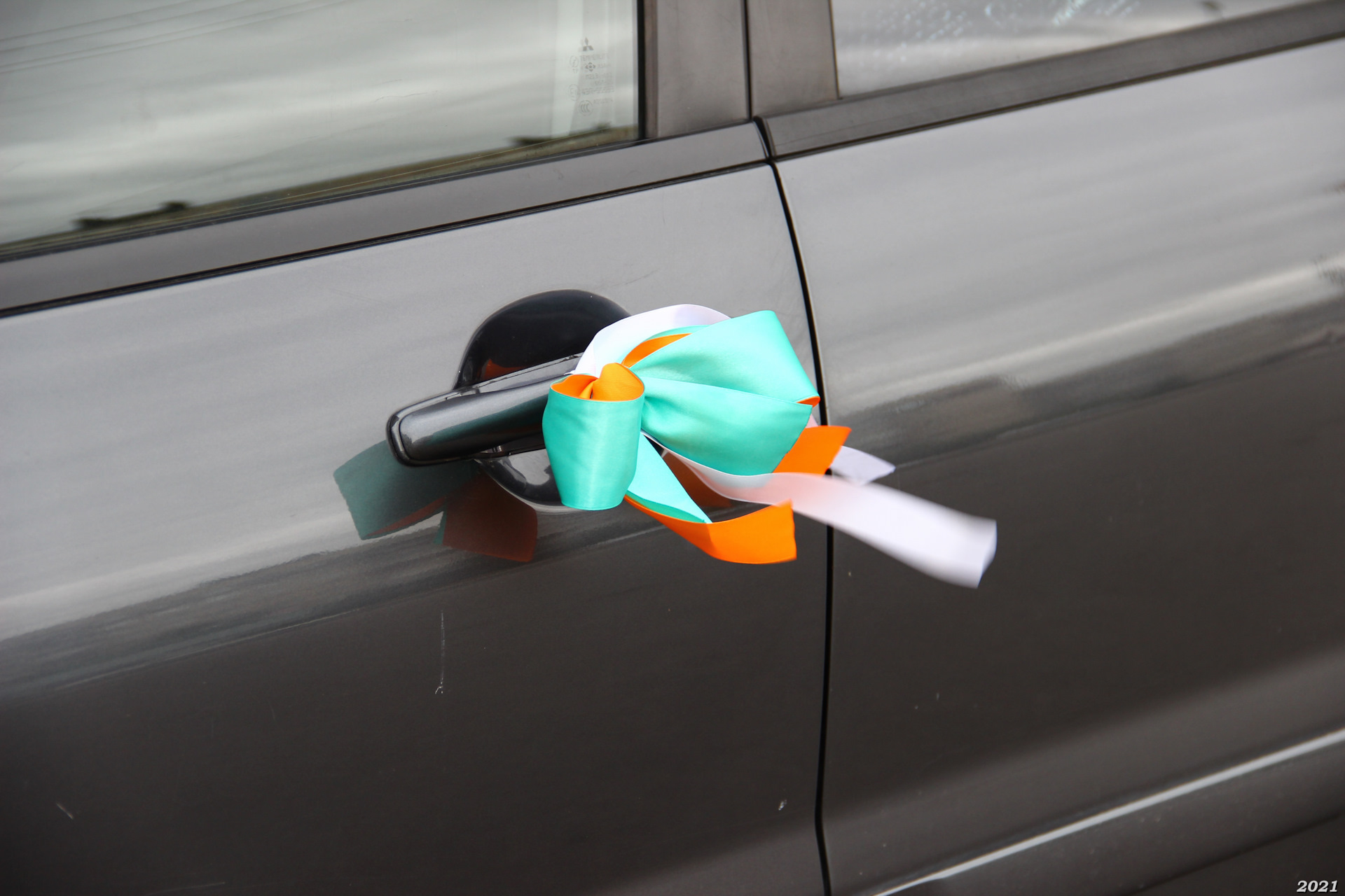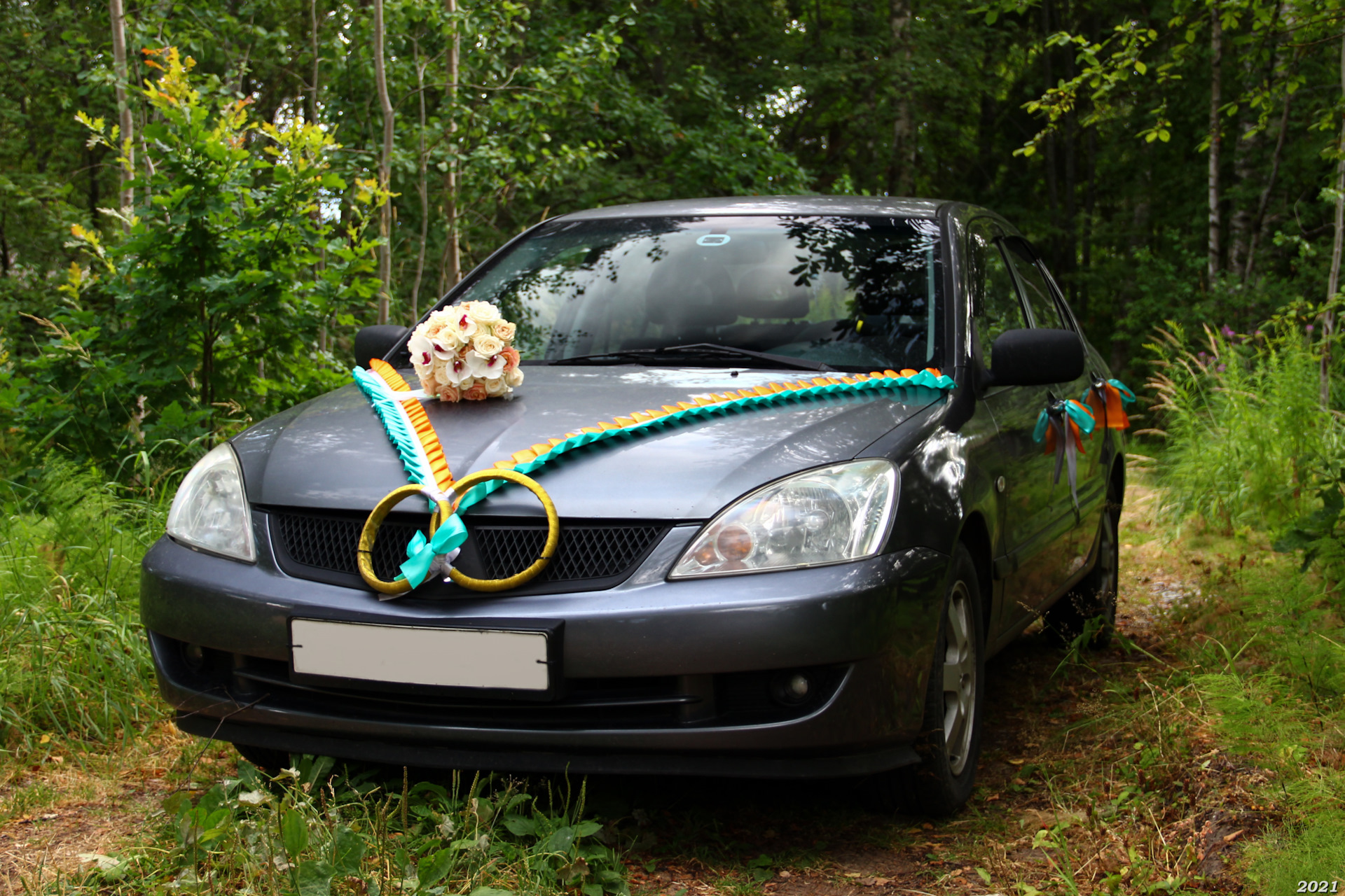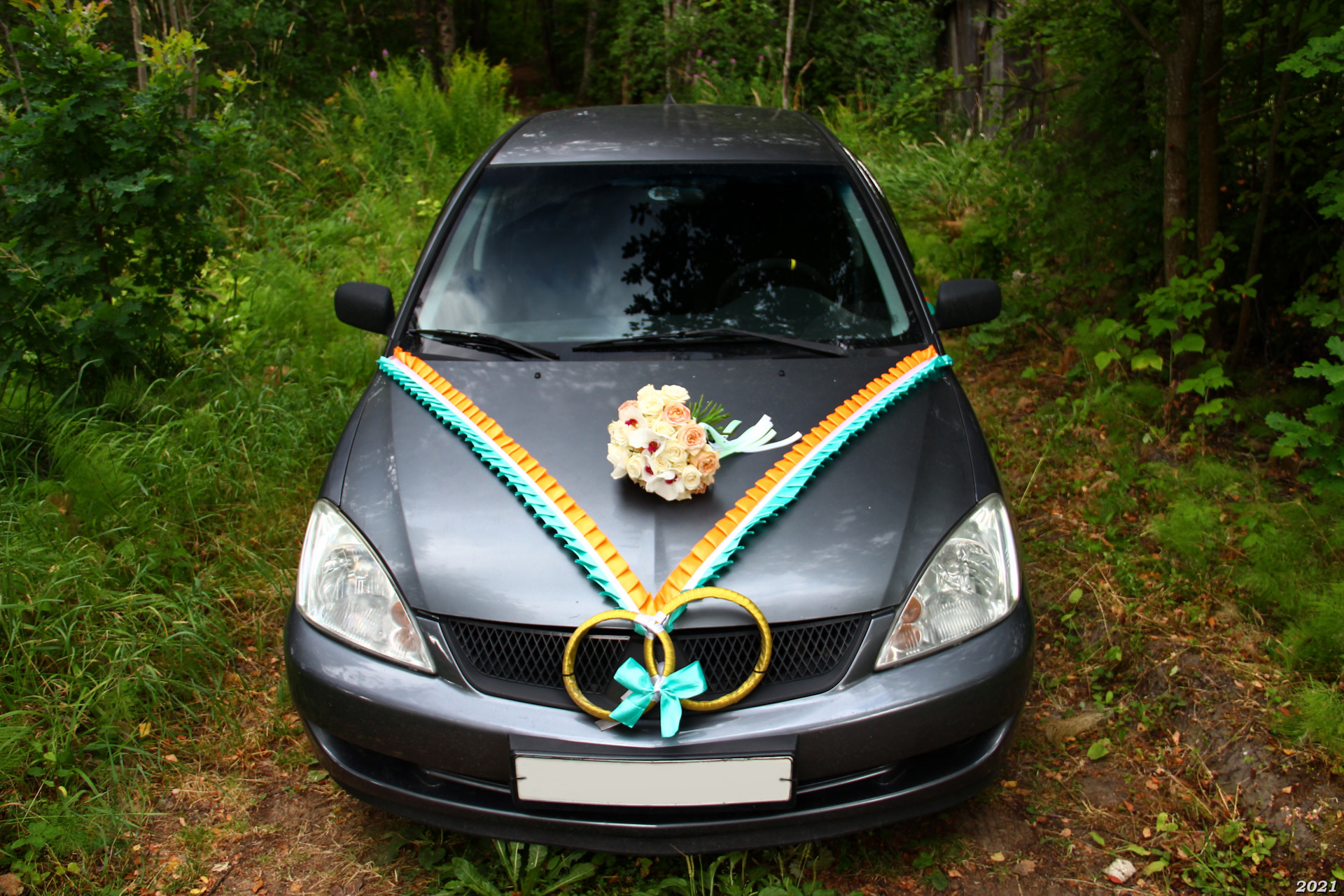 Месяц назад Лансер активно поучаствовал в важном событии — моей свадьбе. Пару дней он покрасовался наряженный в свадебные украшения моего собственного изготовления — лентах и кольцах) Цвет лент под цвет платья невесты с контрастным оранжевым. Кольца мягкие, безопасные.