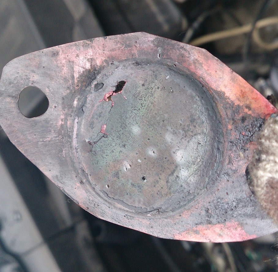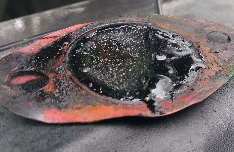 Не много, но этого достаточно, чтобы масло и сажа образовывали мазутоподобную гадость во впускном тракте. Основной вред впускным клапанам – они зарастают этой дрянью, нарушается теплоотвод, да и их нормальная работа нарушается. Вот фото заглушки из меди, что ставил на фрил. Интересно, не иначе серная кислота образуется, разъела даже медь…
