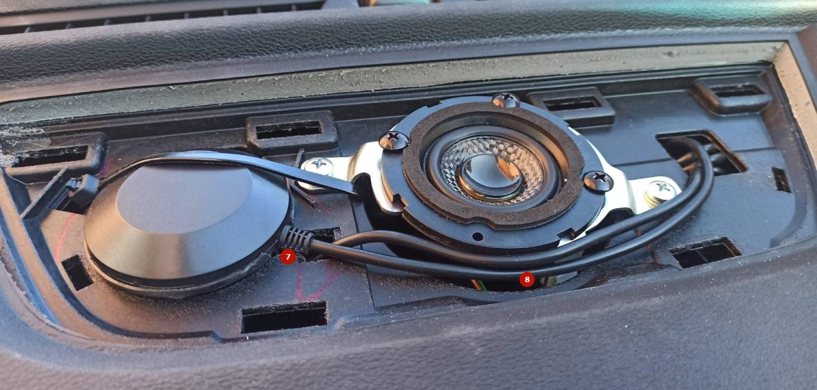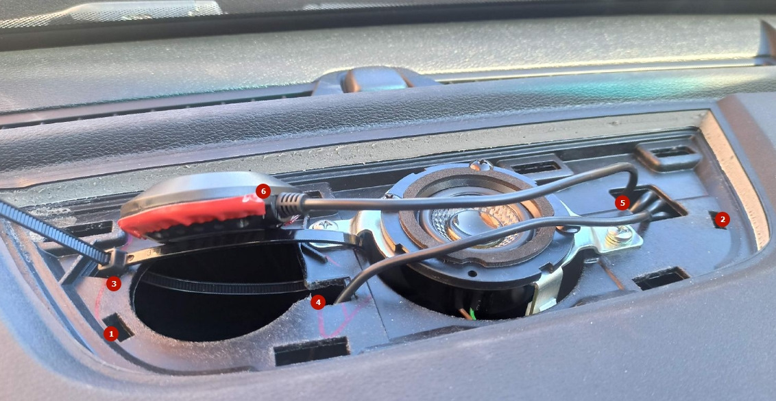 Но небольшой кусок провода все равно болтается и скрутка излишков кабеля опять же занимает место в консоли перед ubs-гнездами, поэтому в итоге вернул под лобовое стекло под крышку центрального динамика.