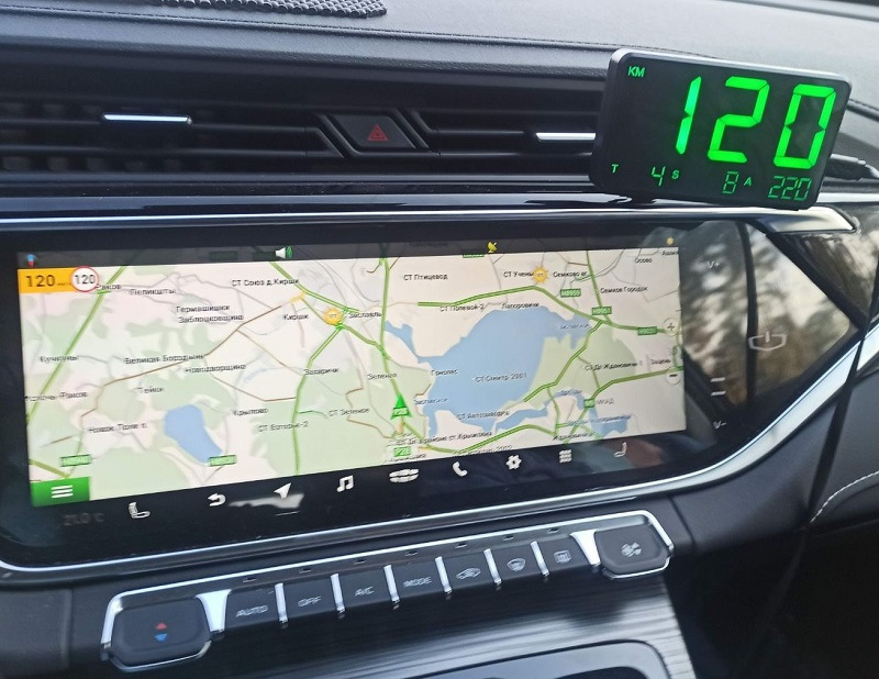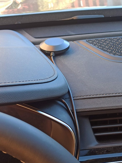 После подключения в принципе можно было оставить прямо рядом с usb-гнездом (где штатная беспроводная зарядка), но в таком случае слегка затягивается первичный прием, поэтому положил прямо под лобовое — где максимальный обзор неба и спутников на нем: