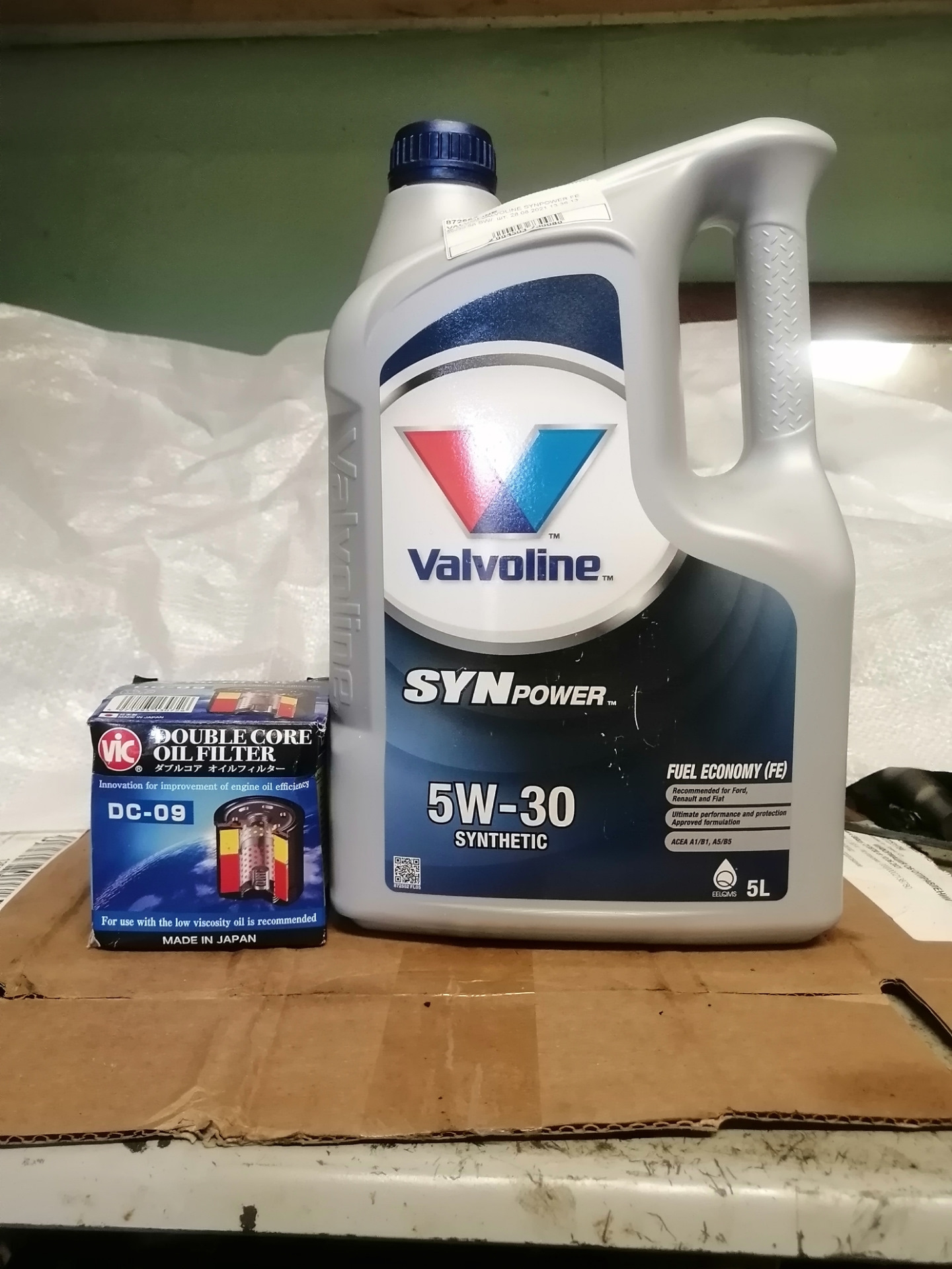 Пришло время заменить масло в моторе. Масло Valv 5w30, a5b5, 5 литров, цена 2400р. Фильтр масляный VIC цена 480р. Процесс замены масла прост: откручиваем маслозаливную крышку, вынимаем щуп, откручиваем сливную пробку и аккуратно сливаем отработанное масло. Затем сливную пробку наживляем обратно и принимаемся за масляный фильтр. Откручиваем фильтр, протираем ветощью посадочное место фильтра. Затем опять выкручиваем сливной болт и сливаем остатки масла. Теперь берём большой шприц со шланжиком и откачиваем остатки масло в поддоне! Вскрываем новую канистру с маслом, достаём новый масляный фильтр и ЗАПОЛНЯЕМ ЕГО НОВЫМ МАСЛОМ! Закручиваем фильтр на свое место, заливаем новое масло при этом следя за уровнем. До этого было залито масло NESTE 5W30. Канистра 3,7л брал кажись за 1700р, но пришлось ещё докупить литрушку на долив. Такие дела, Всем удачи! 😉