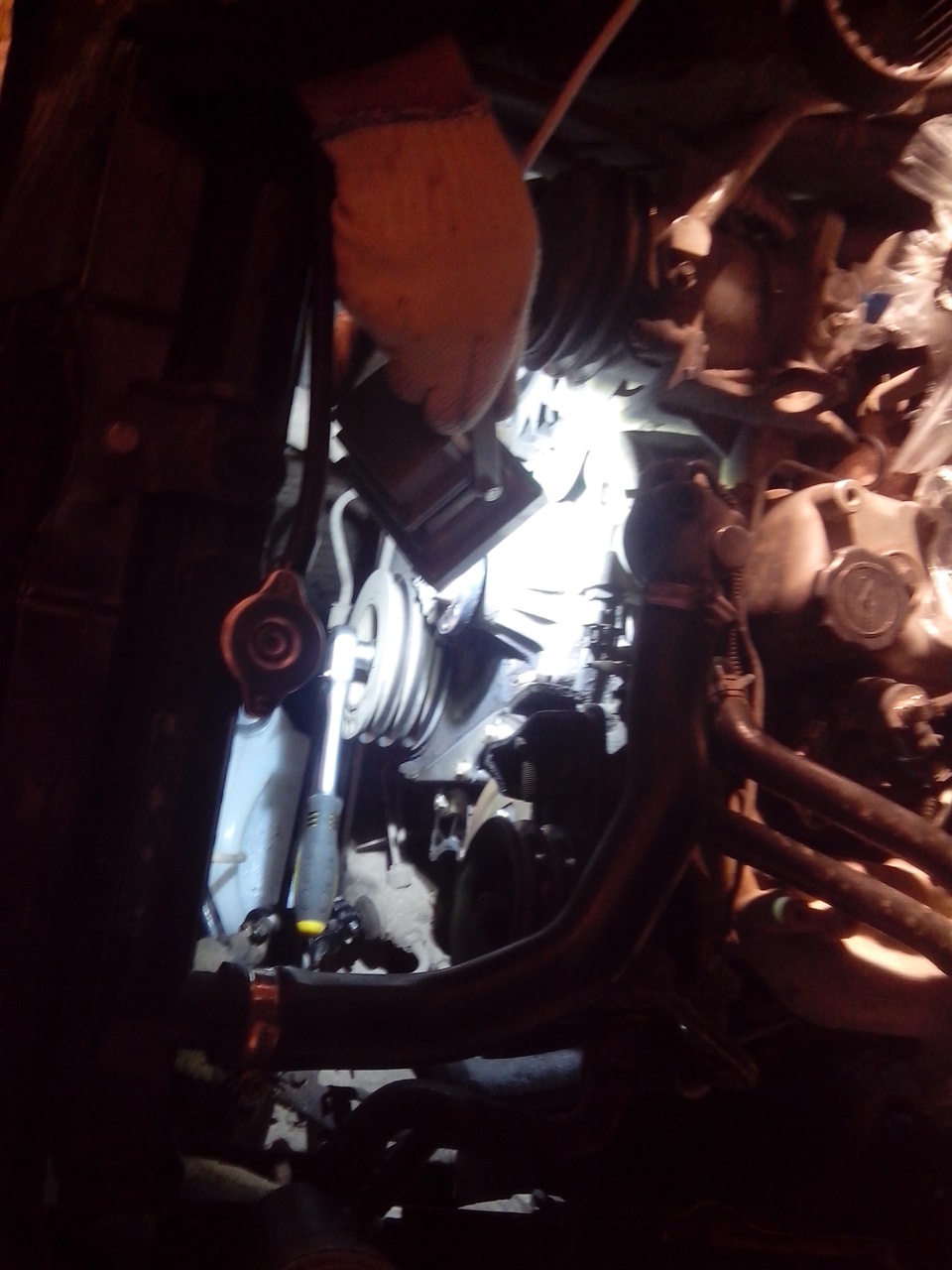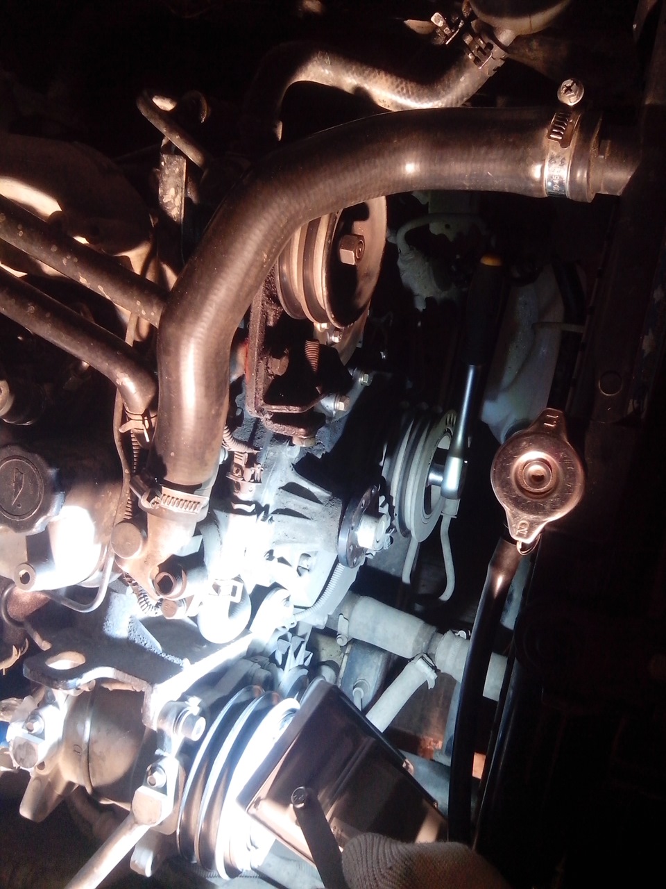 В продолжении темы по ремню ГРМ www.drive2.ru/l/4584810/ . Напомню пробег припокупке-89 т.км, предыдущий хозяин ремешок не менял, и не трогал, а я в этом случае думал, что его не меняли вовсе. Прочитав инструкцию по замене ремня ГРМ: www.chinamobil.ru/wiki/do…great_wall_hover:dizelgrm и Красный форум: chinamobil.ru/bb/viewtopic.php?p=753037#753037, собрался с мыслями и отправился в гараж. Снял воздухозаборник, эл вентилятор, ремни ГУР и помпы. Ремень ГРМ оказался менянным, с квадратным зубом состояние хорошее, видны следы на шляпке болтов шестерни ТНВД.