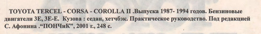 Ещё тогда я узнал, что существует руководство по ремонту и эксплуатации "Toyota Tercel / Corsa / Corolla ll с 1987 по 1994 год. Бензиновые двигатели 3E, 3E-E." от издательства с интересным названием "ПОНЧиК". Но книжки в электронном виде нигде не было — видимо никому не хотелось сканировать 248 страниц.