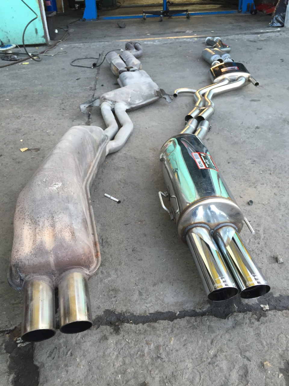 5. Избегая жестких углов (гибами или сегментированным путем) идем к банке, вторичный резонатор выбрасываем. Дальше выбор не особо большой, из бюджетного даже не выбрать ничего, потому что даже сток стоит под 25к. Так как мотор довольно объемный и по мощности весьма неплохой, имеет смысл остановиться на банке SuperSprint или Eisenmann. Из более бюджетного — прямоточные банки от Клабтурбо и им подобных.