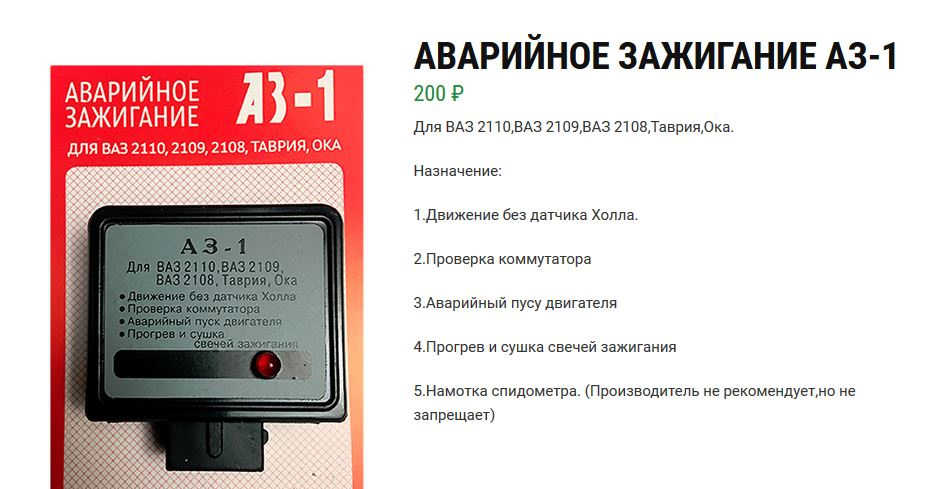 Аварийное зажигание (АЗ-1) можно использовать в дождь и при езде по лужам (для прогрева и сушки свечей), для проверки электронного коммутатора (ВАЗ, ЗАЗ, Ока) или при выходе из строя датчика Холла. Рекомендуется двигаться в режиме АВАРИЙНОГО ЗАЖИГАНИЯ со скоростью не более 90 км/ч, в режиме малых нагрузок. Расстояние пробега в этом режиме не ограничено!