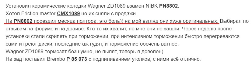 там хвалят своркс… "Машина прошла уже чуть больше недели и чуть больше 1000 км, по словам шефа колодки не скрипят, торможение очень эффективное"2