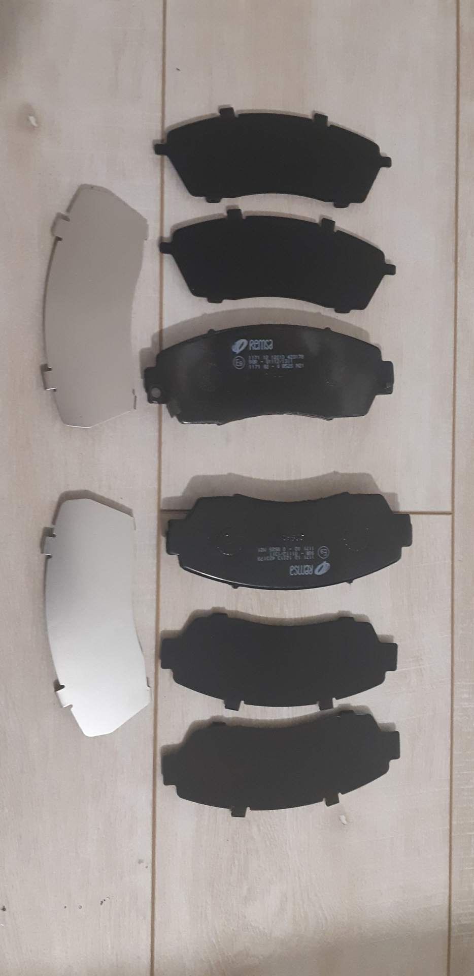 Получается рефленые сначала на все колодки, потом на внутренние к поршням еще металлические блестящие. Первый раз с таким бутербродом сталкиваюсь. Хотел поменять колодки что бы лучше тормозили, остановился на Remsa.