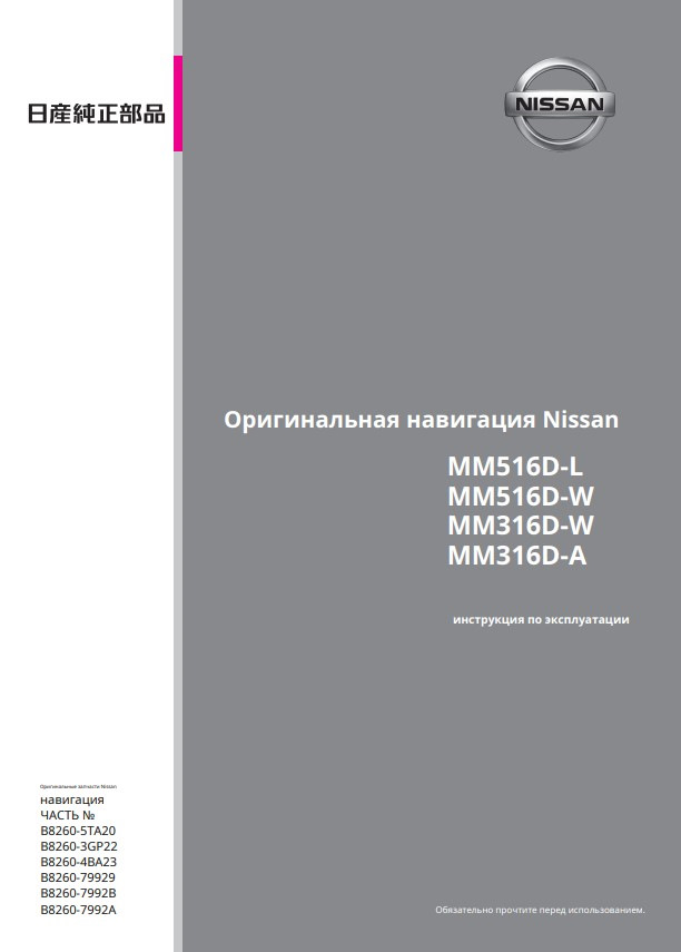 Добрый день. Скачал с Оф.сайта Nissan мануал мультимедиа MM516D-L(W), MM316D-W(A). Разделил на небольшие части, перевел с помощью специального сайта, пересобрал в один файл pdf переведенные части. Пользуйтесь, может кому поможет. Мануал мультимедиа MM516D-L(W), MM316D-W(A) RU