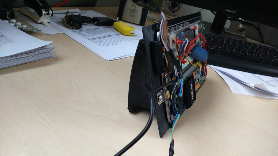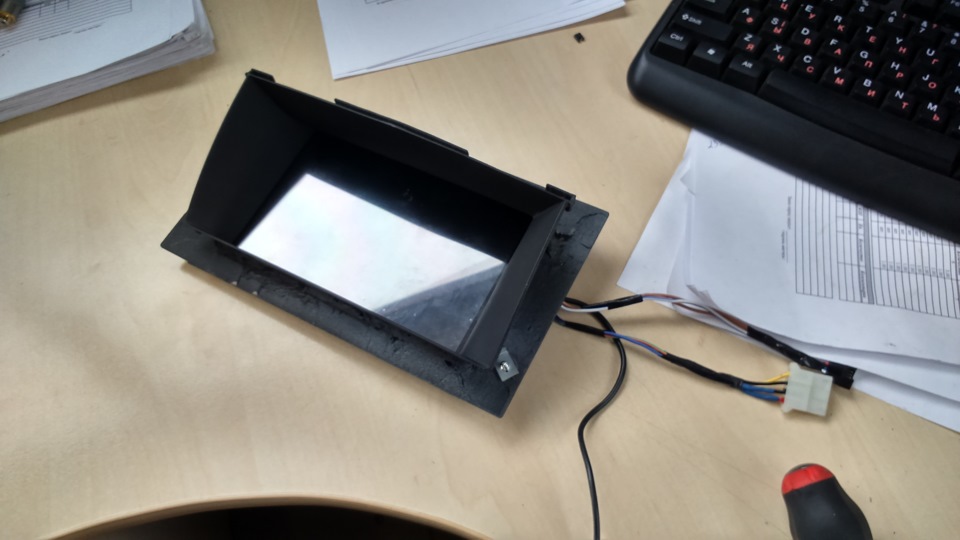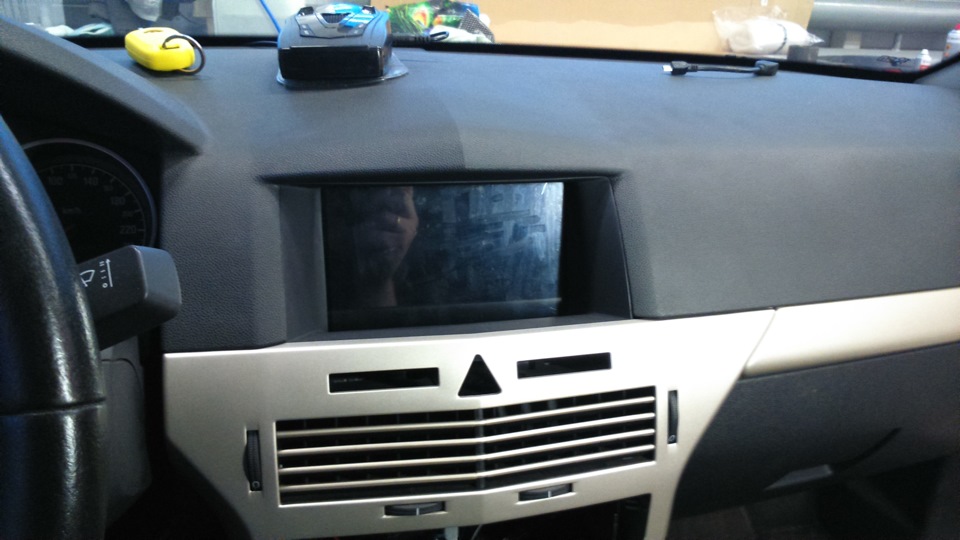 И снова всем приветы! Сегодня смог выделить время для доработки рамки для планшета и дальнейших работ по установке. Неделю назад начал делать рамку. Была зверски порезана и поточена купленная рамка для CID экрана, к которой я приделал рамку от какой-то 2-х диновой магнитолы (к которой я и собирался крепить планшет). Далее в ход пошла эпоксидка и стекломат, шпатлевка, грунтовка и матовая черная краска. Затем к рамке были приклеены направляющие, дабы планшет не двинулся с места. Ну а потом он был прижат к рамке парой металлический уголков, которые раньше были ушками крепления релюшек))