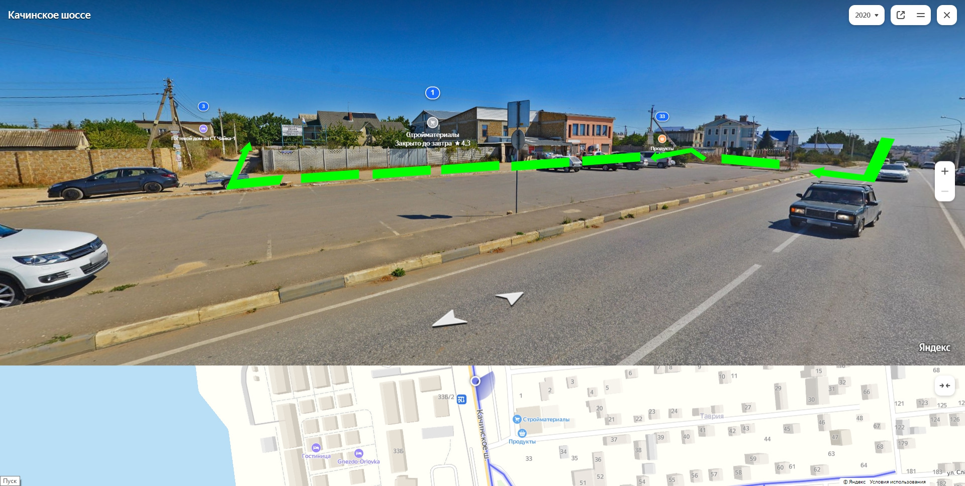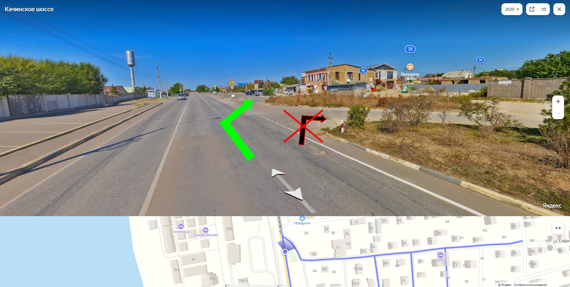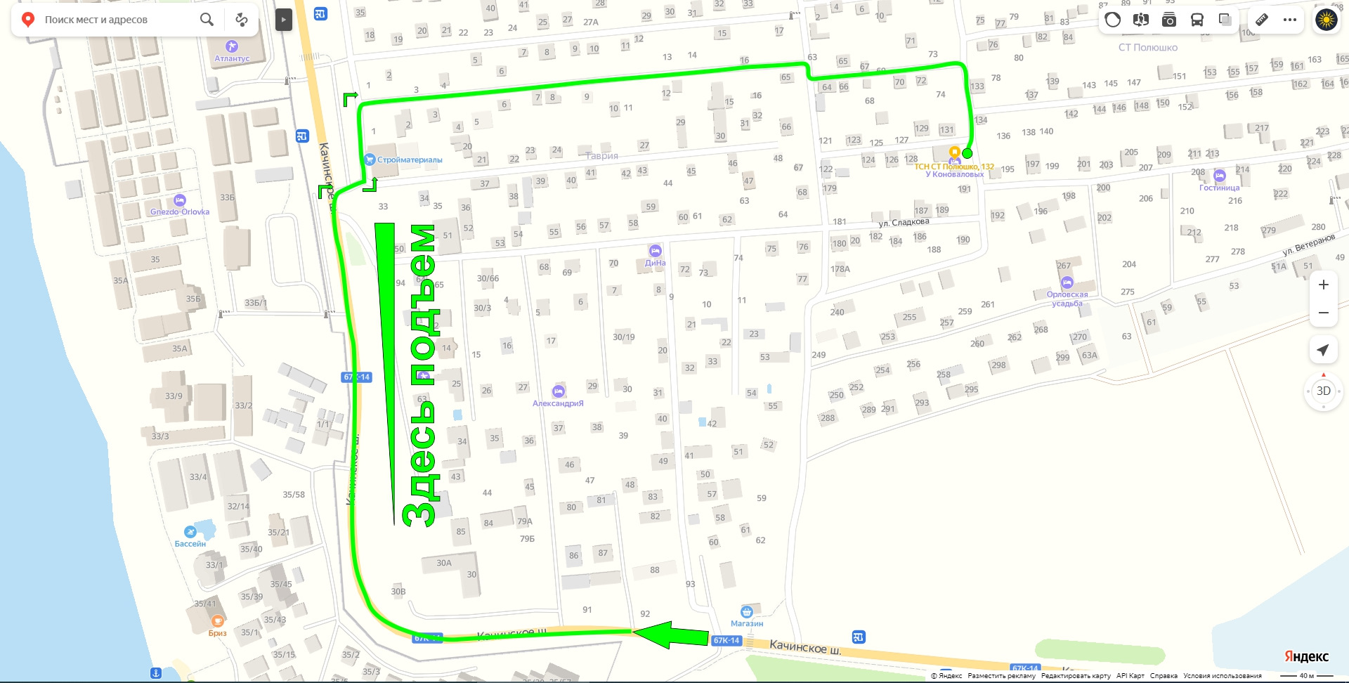Изначально нужно попасть в Орловку на Качинское шоссе. Ехать нужно всегда прямо. Потом будет подъем и поворот направо. На верху этого подъема нужно свернуть направо в сторону магазина: