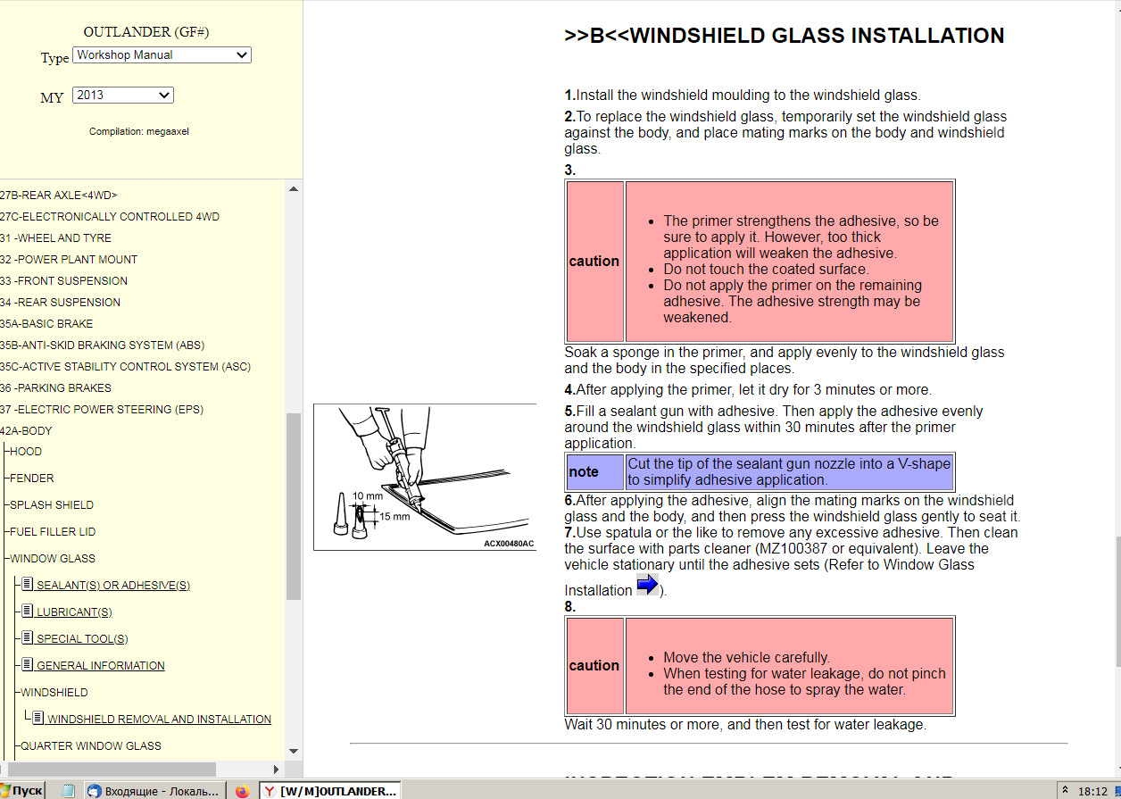 Сколько наносить — зависит от марки и модели машины. На Фольцвагенах наносится очень мало, на Митцу — можно не жалеть. Официальный техдок митцу предписывает размер носика тюбика с клеем. Привожу скриншот.