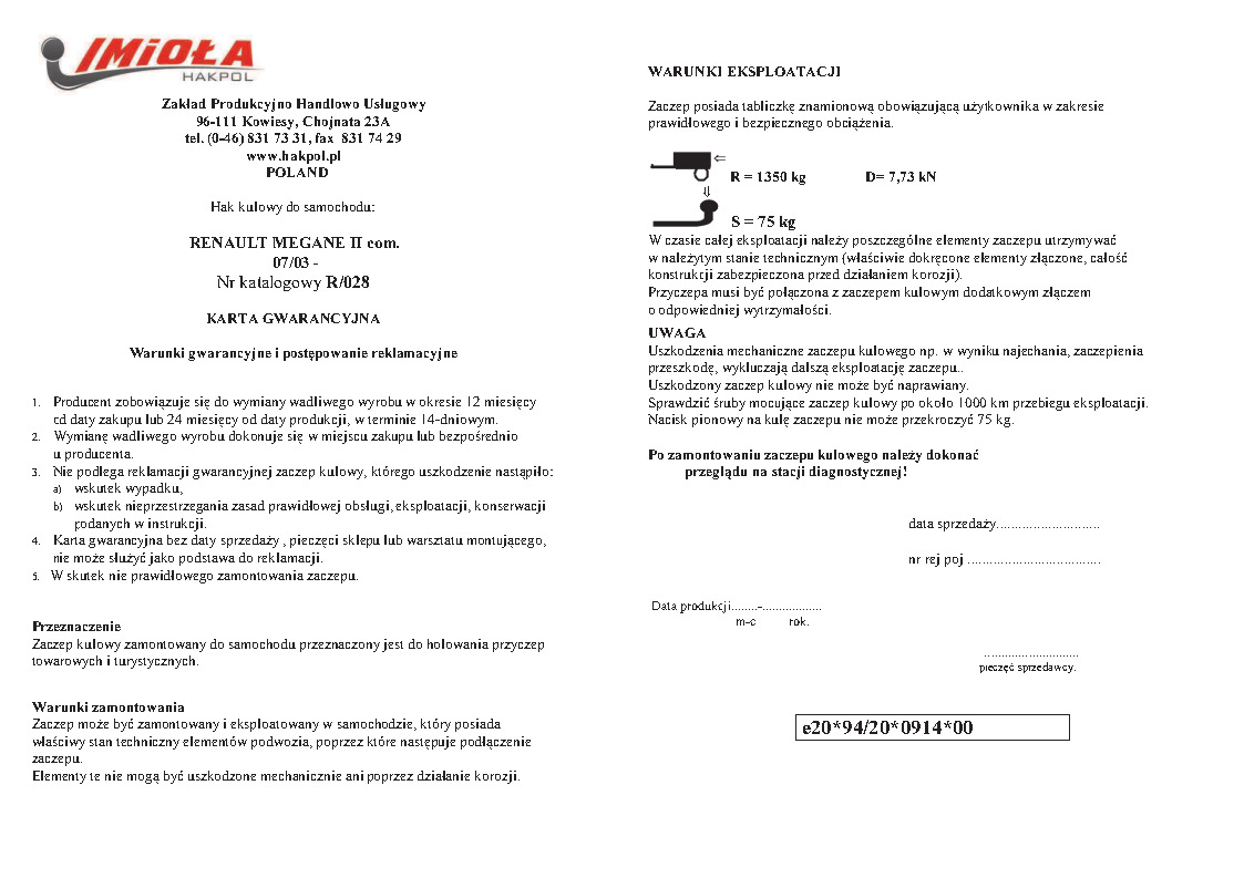 Фаркоп Imiola для Renault Megane II универсал, Grand Tour 2003-2008. Артикул R.028