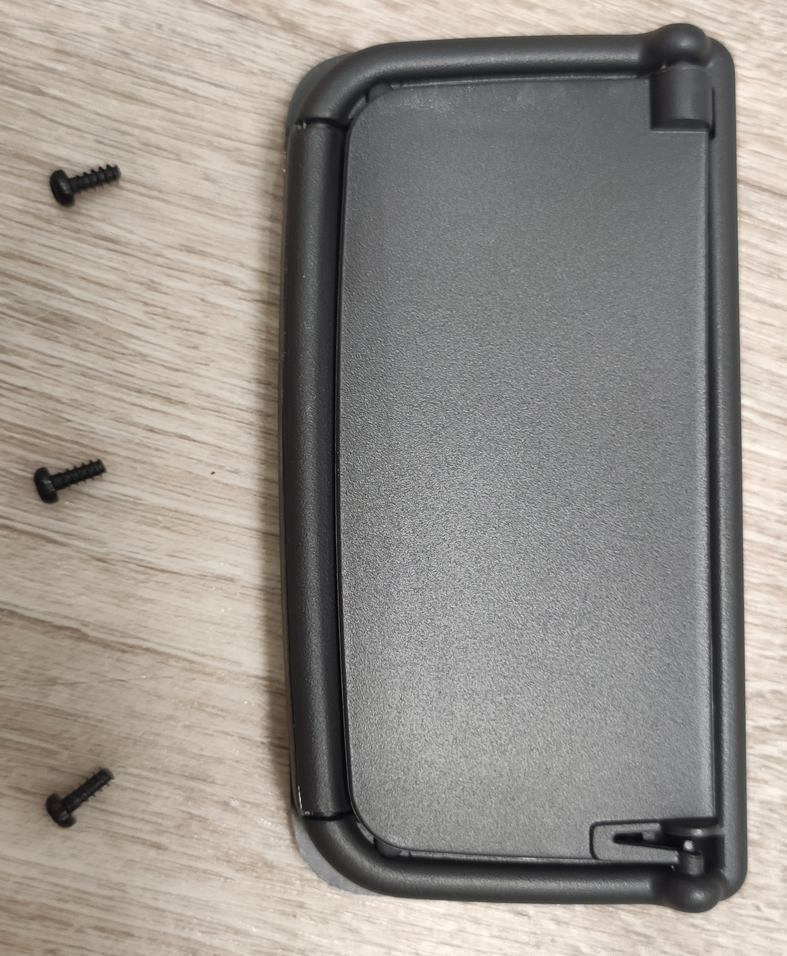 Размечаем, прорезаем, кстати сказать материал (картон) из которого сделана шторка режется прекрасно, далее приставляем ручку и в местах где должны быть саморезы, шилом делаем прокол, немного увеличиваем диаметр, чтобы в него плотно вошла пластмассовая втулочка самой ручки и закручиваем саморезы.
