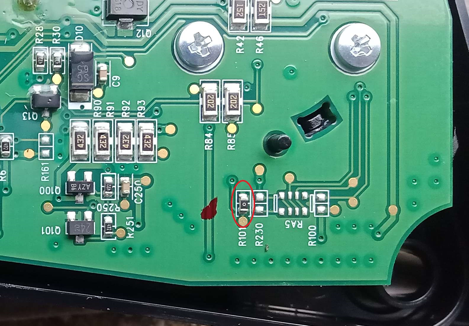 Далее просто: 4 самореза чтобы снять лицевую рамку и 3 защелки, чтобы разделить пациента на 2 части. Видим самое интересное — на печатной плате: "резистор" R101, который является просто перемычкой (его сопротивление "0"), о чем прямо на нем и написано.